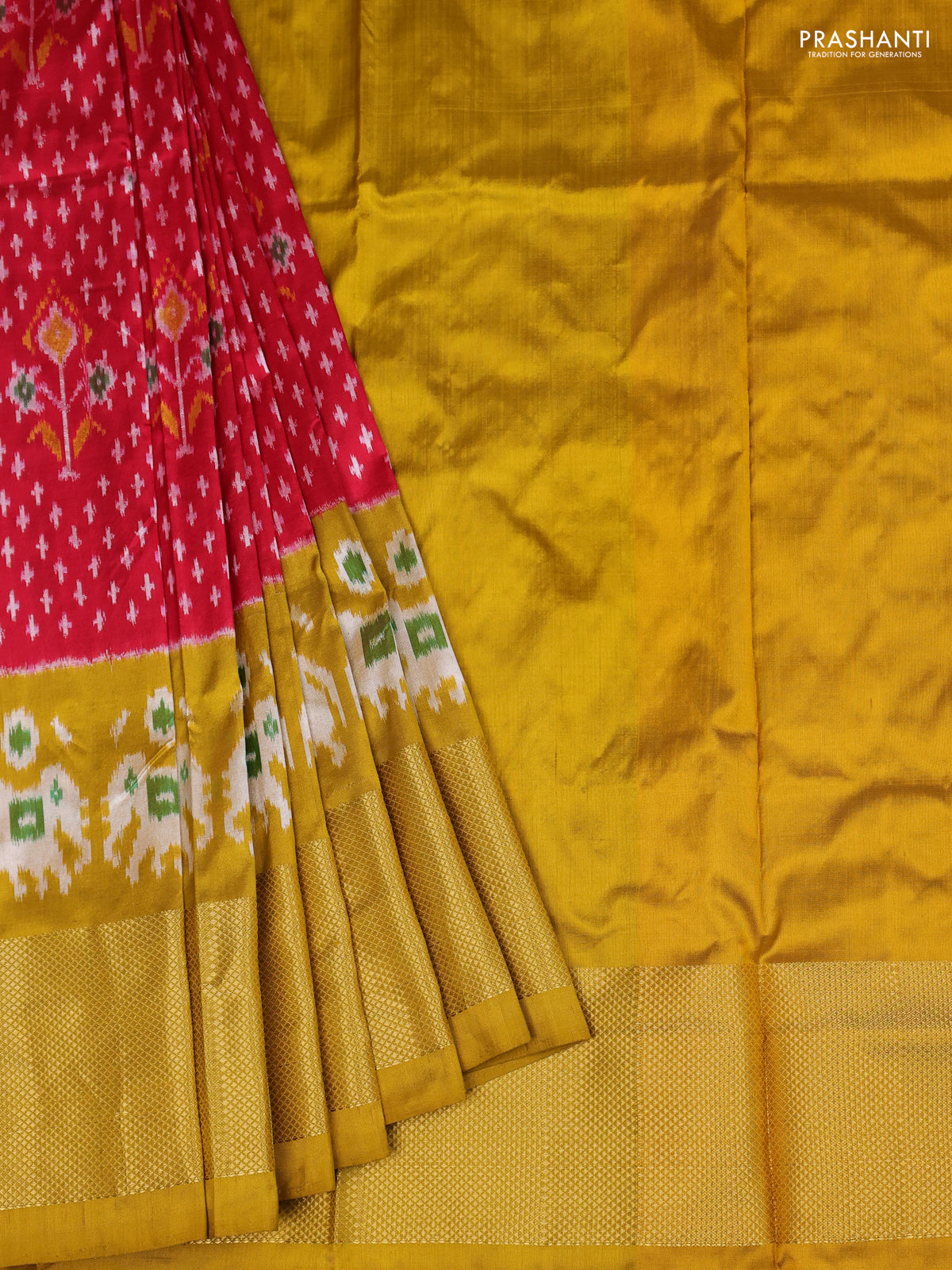 Ikat silk kids lehenga red and mustard yellow with allover ikat weaves and long ikat woven zari border