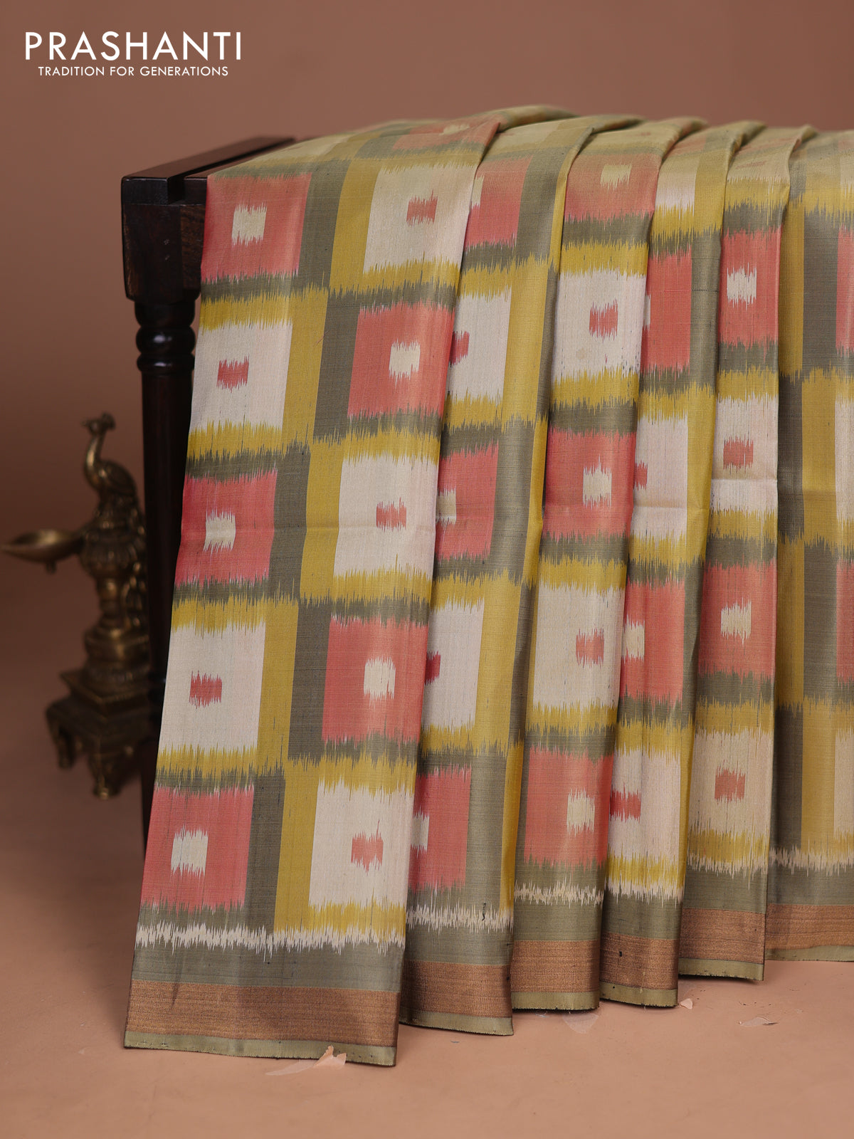 Ikat soft silk saree lime yellow and elaichi green with allover ikat woven buttas and zari woven border