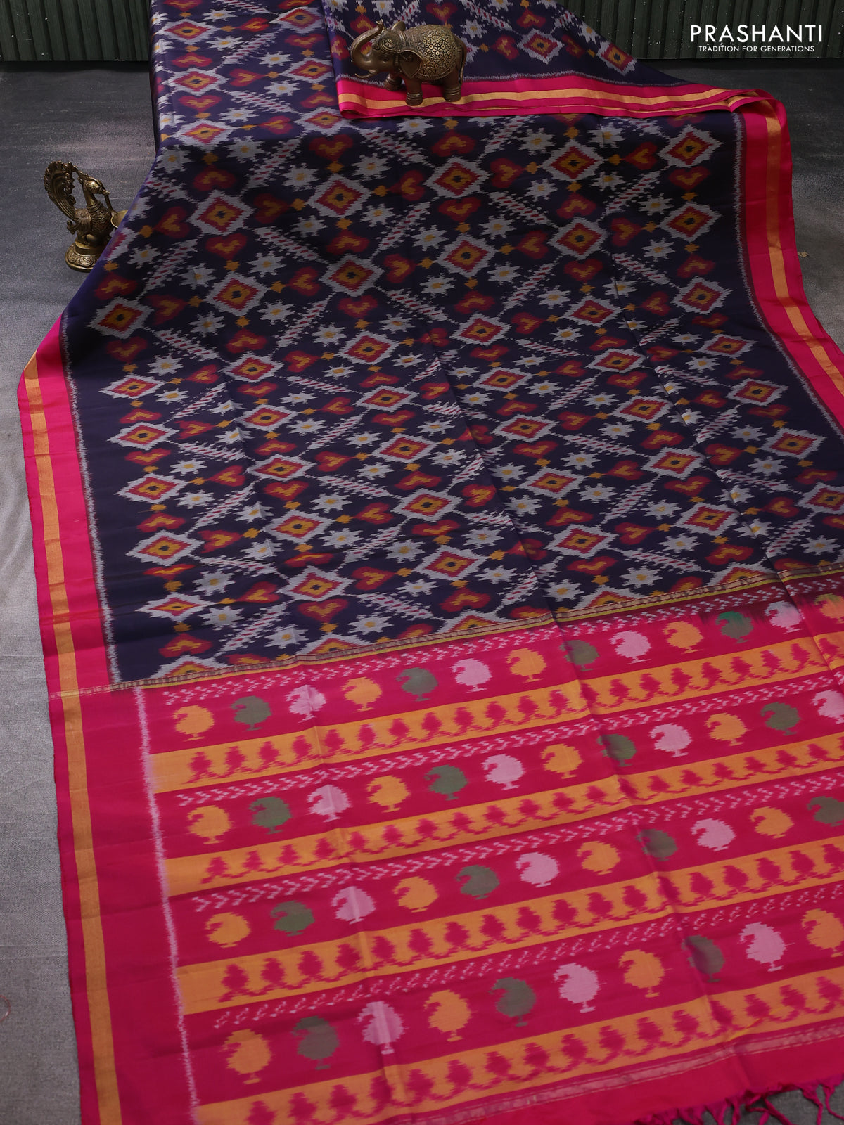 Ikat soft silk saree navy blue and pink with allover ikat weaves and zari woven border