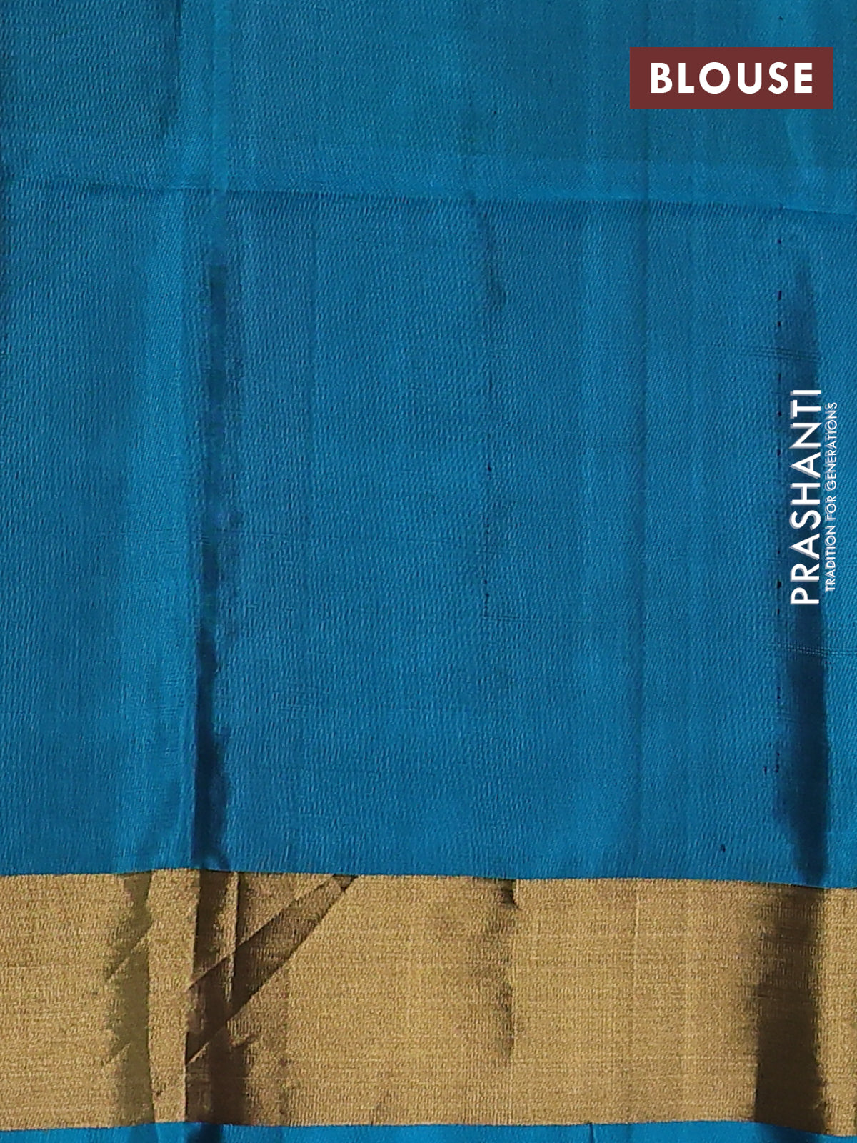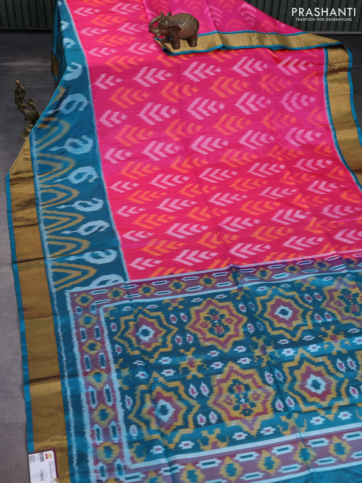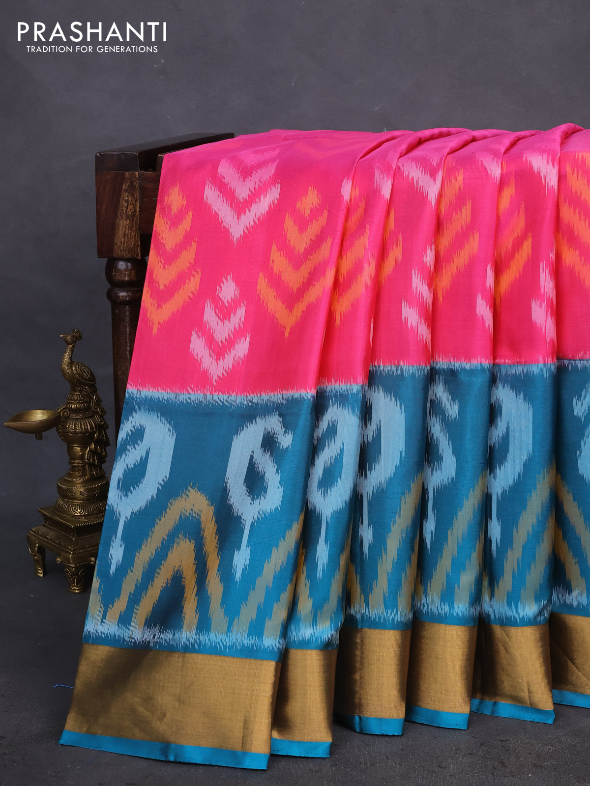 Ikat soft silk saree pink and teal blue with allover ikat weaves and zari woven border