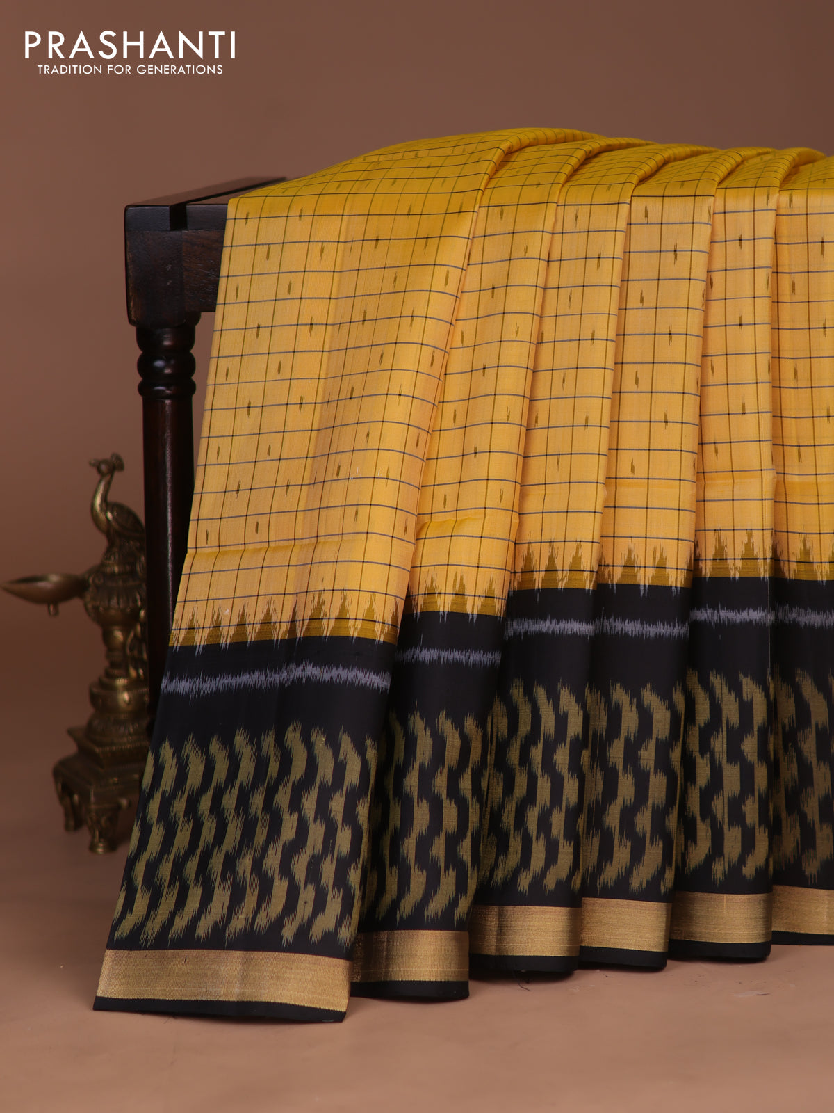 Ikat soft silk saree yellow and black with allover checks & ikat butta weaves and long temple ikat woven zari border
