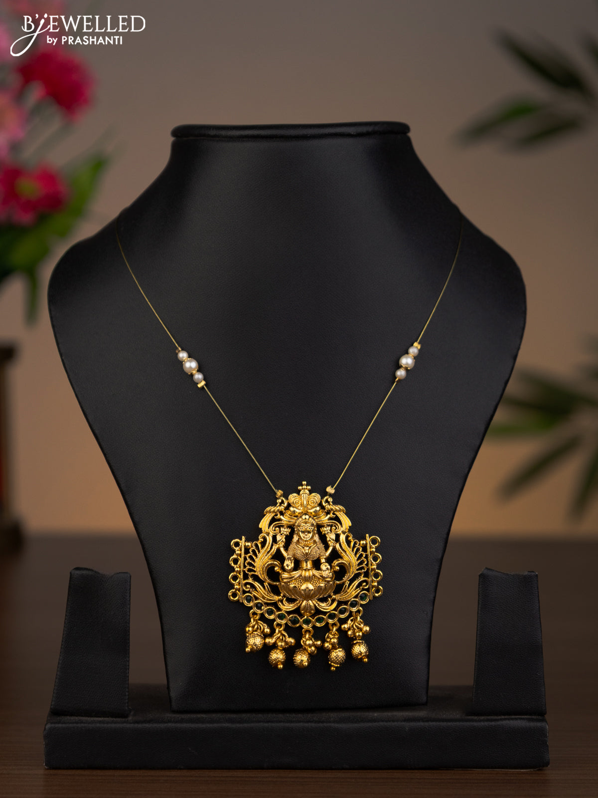 Invisible chain lakshmi pendant with emerald stones and golden beads hanging without earrings
