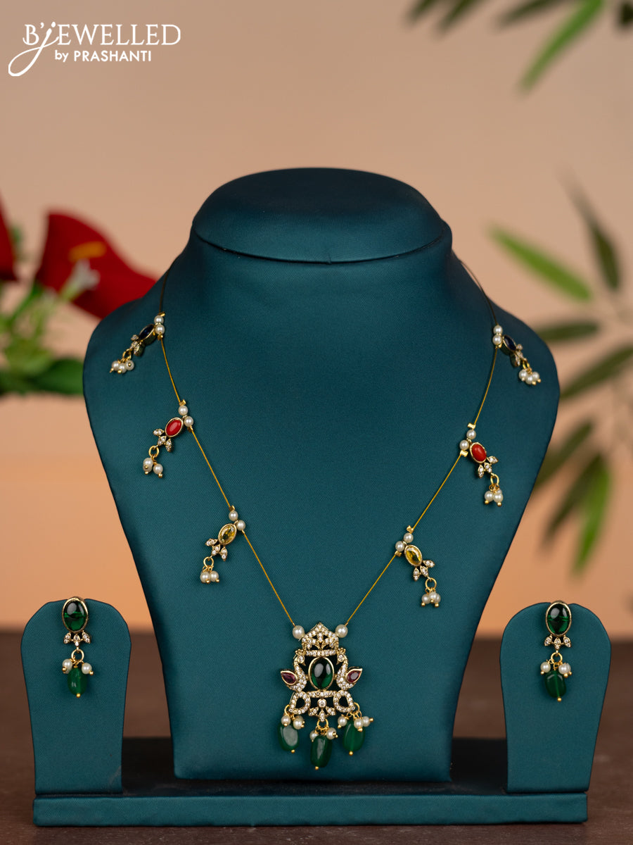 Invisible chain swan design with multicolour & cz stones and pearl & green beads hangings