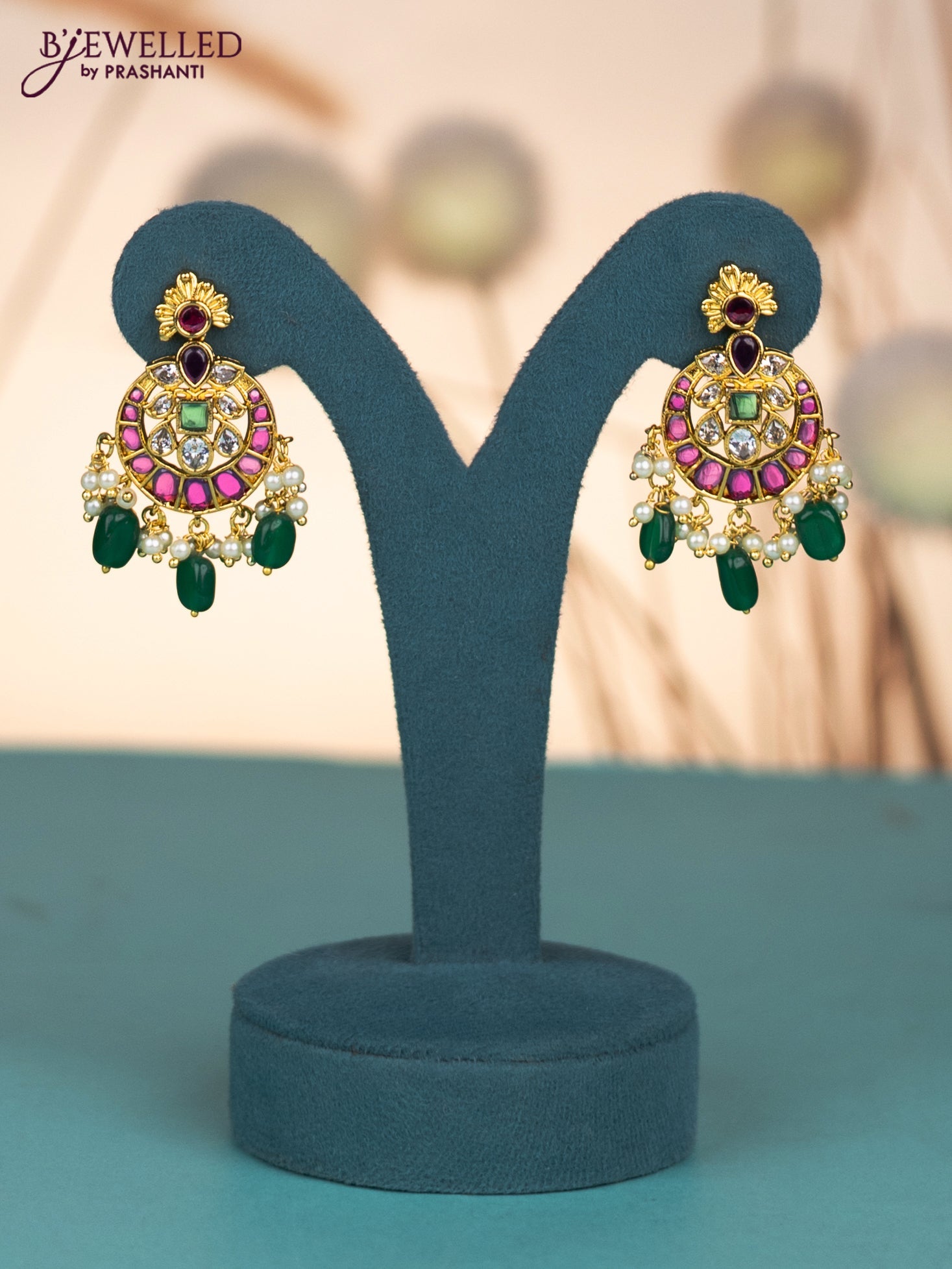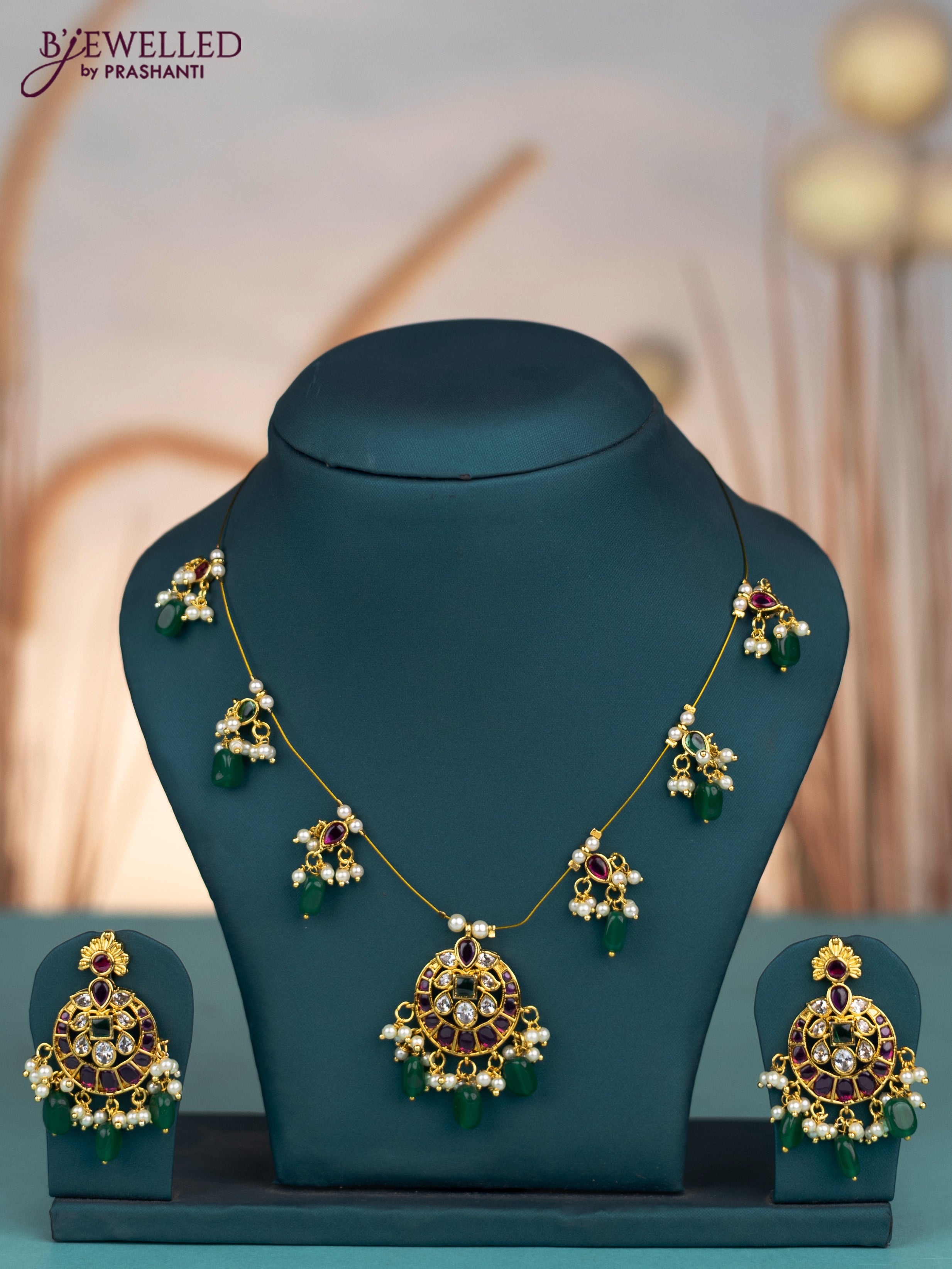 Invisible chain with kemp & cz stones and pearl & green beads hangings