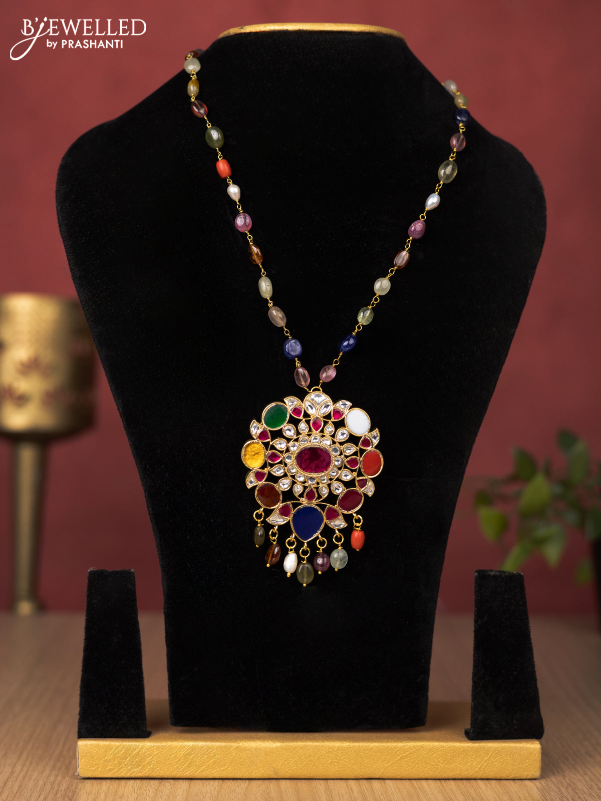 Jadau beaded necklace floral design with multicolour jadau kundan stones with natural beads hanging without earrings