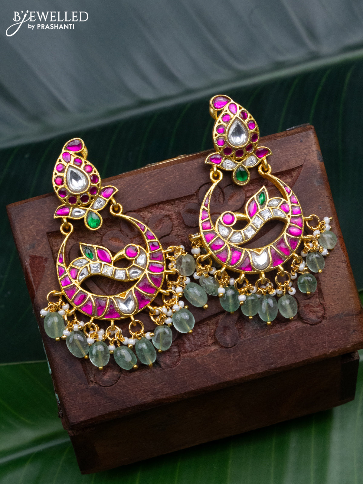 Jadau earrings peacock design with jadau kundan stones and pearl & mint green beads hanging