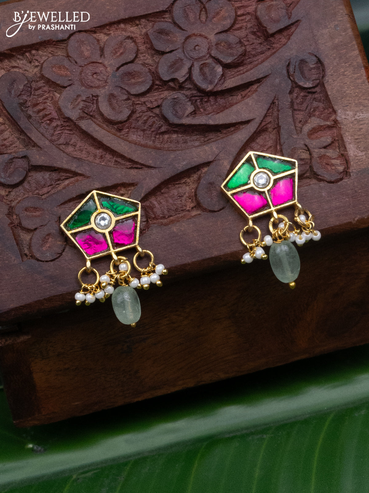 Jadau earrings with jadau kundan stones and pearl & mint green beads hanging