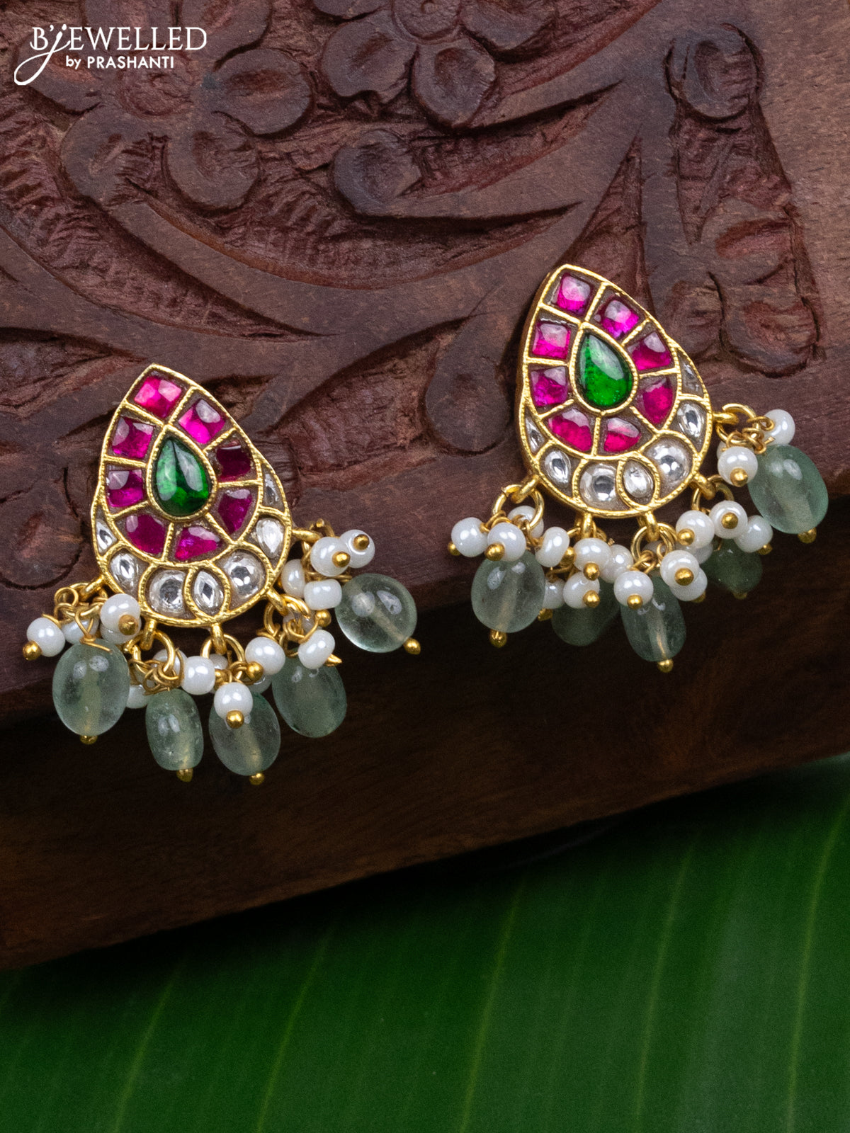 Jadau earrings with jadau kundan stones and pearl & mint green beads hanging