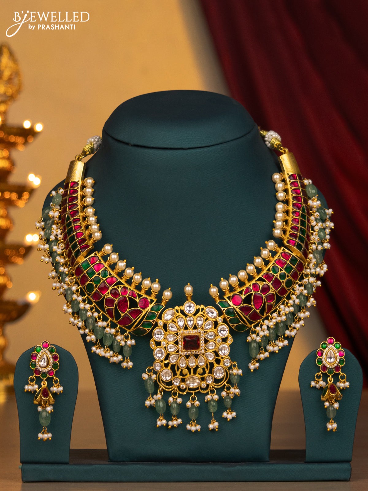 Jadau necklace floral design with jadau kundan stone and green beads & pearl hangings