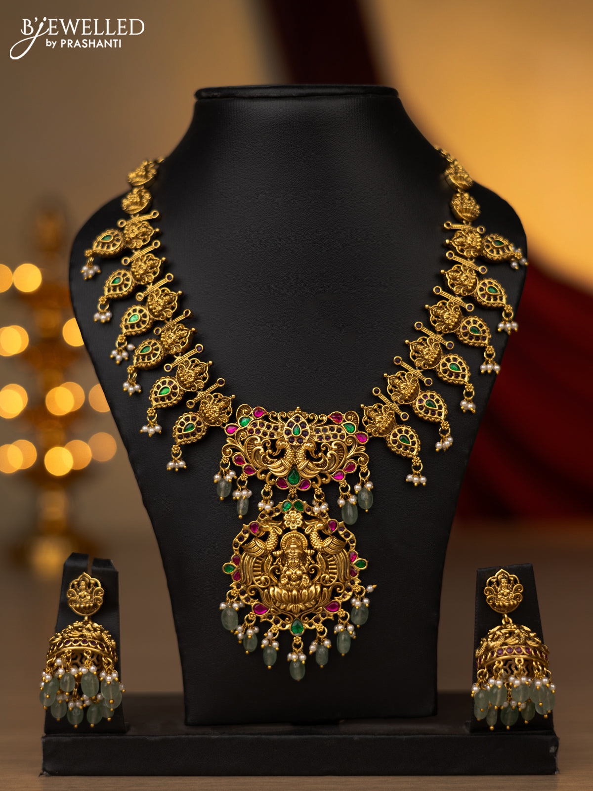 Jadau necklace lakshmi manga design with jadau stones and pearl & mint green beads hanging