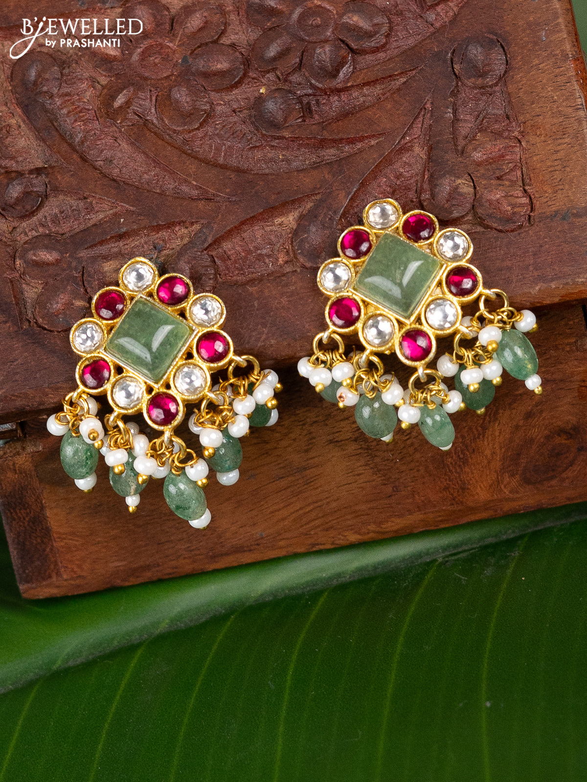 Jadau screw type earrings peacock design with jadau kundan stones and pearl & mint green beads hanging