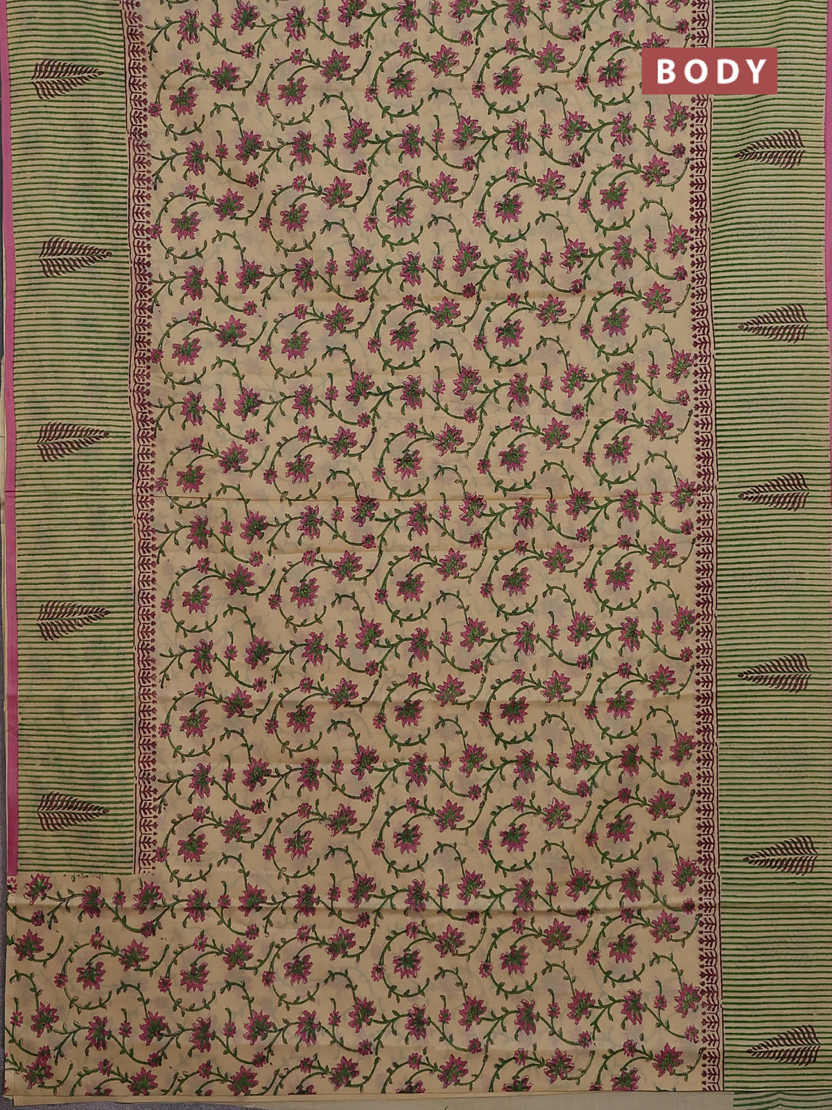 Jaipur cotton saree beige and pink with allover kalamkari prints and long printed border