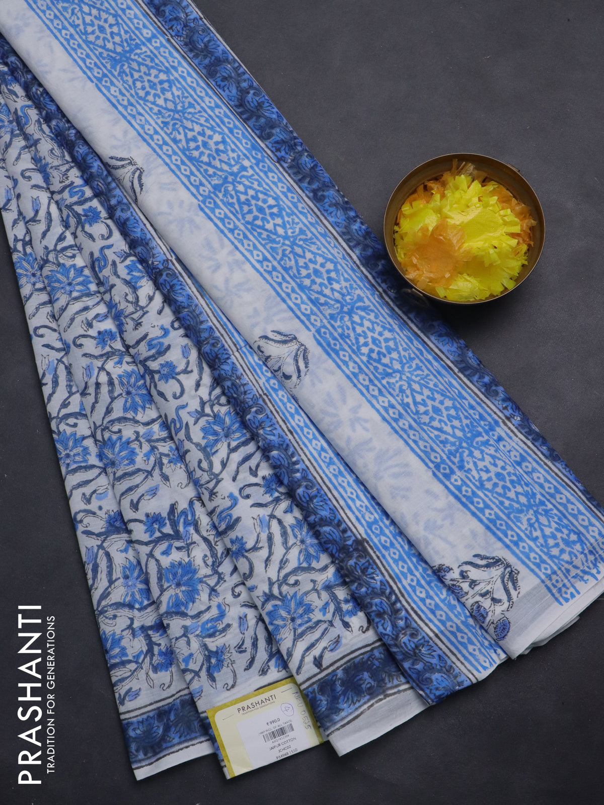 Jaipur cotton saree off white and blue with allover floral prints and printed border