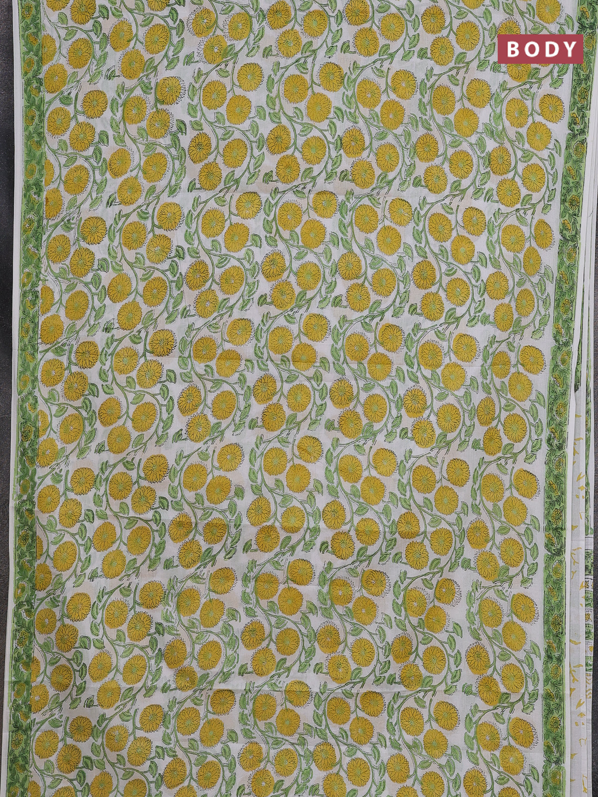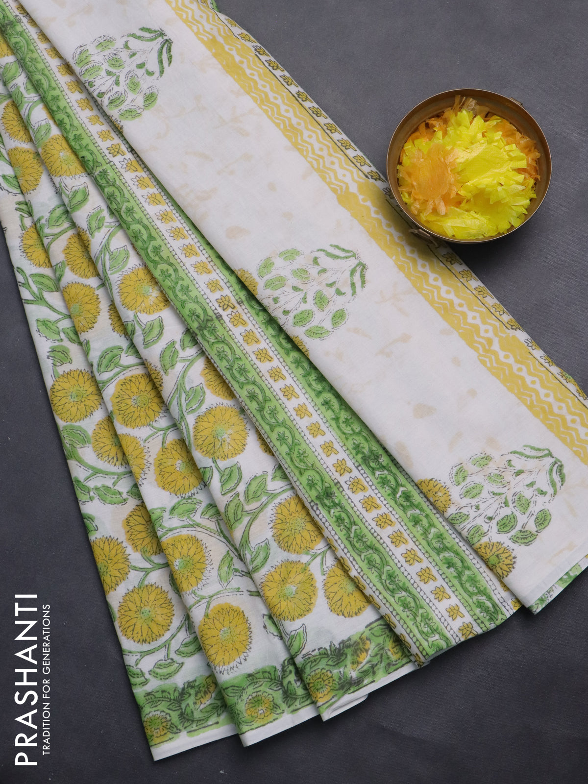 Jaipur cotton saree off white and light green with allover floral prints and printed border