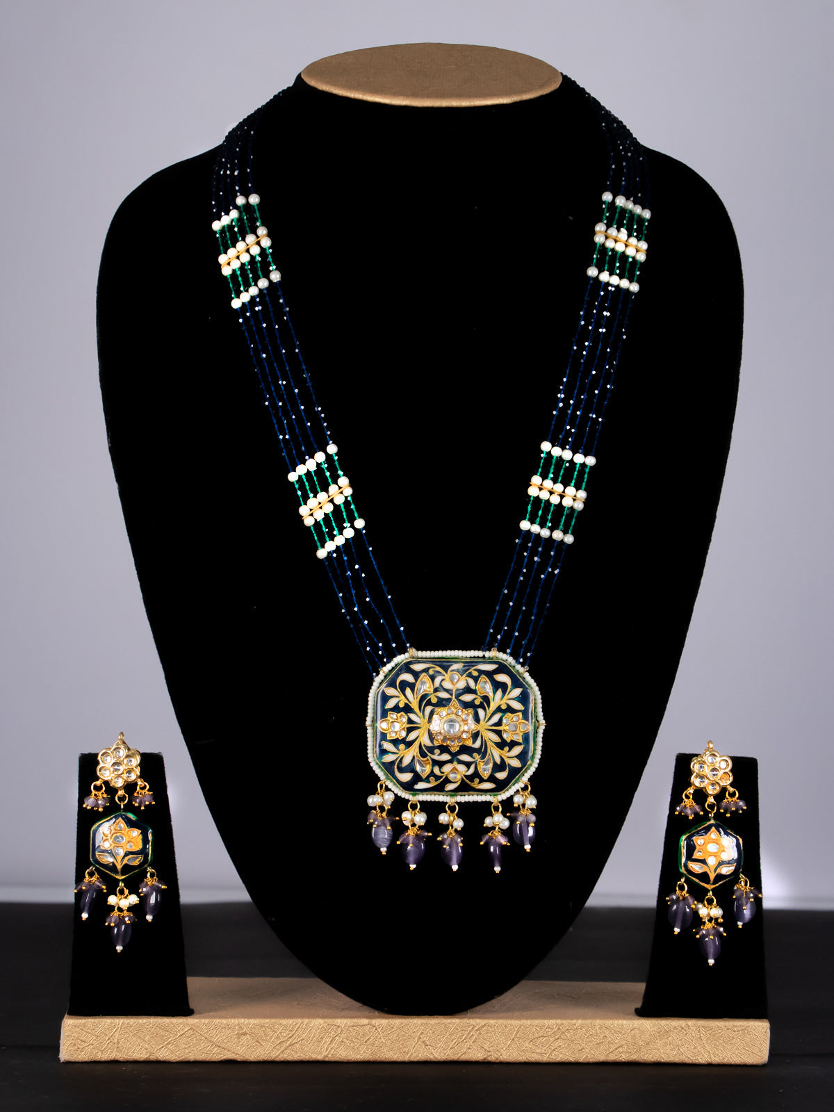 Jaipur crystal beaded blue mid length necklace with minakari pendant and hangings