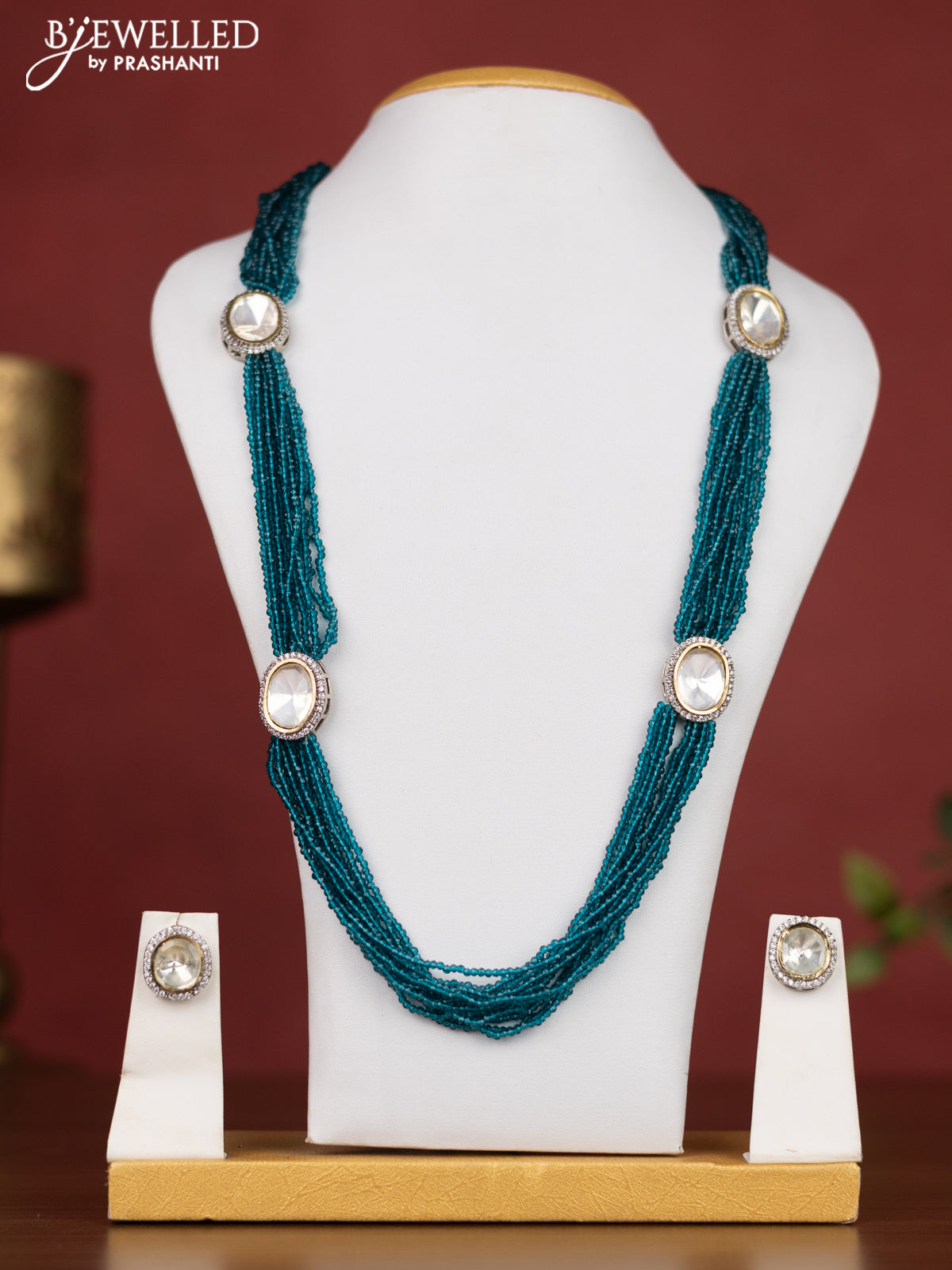 Jaipur crystal beaded multilayer peacock green necklace with cz stones