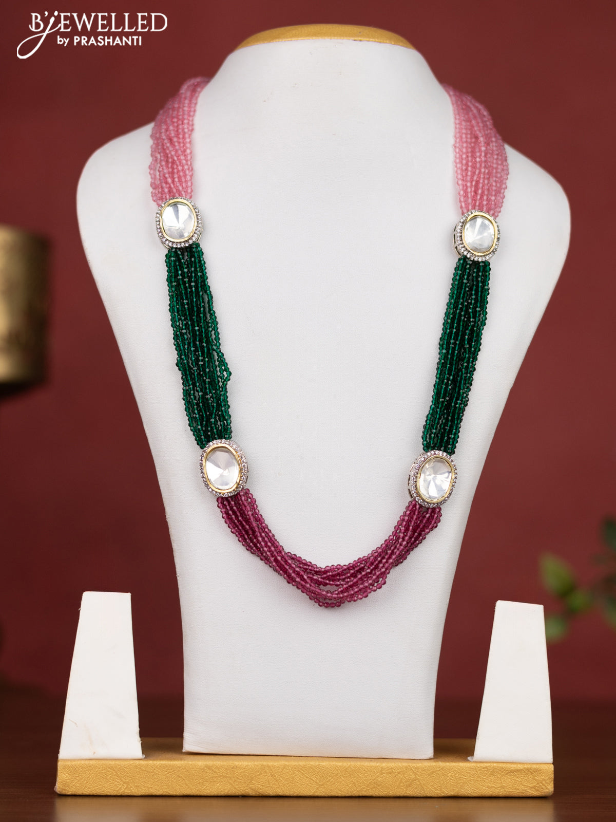 Jaipur multilayer beaded pink & green necklace with cz stones without earring