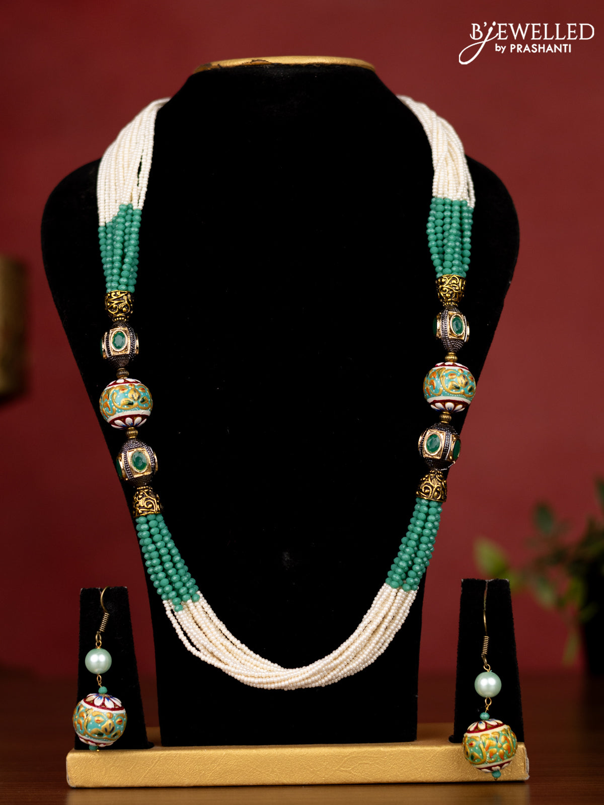 Jaipur teal green crystal and pearl necklace minakari balls