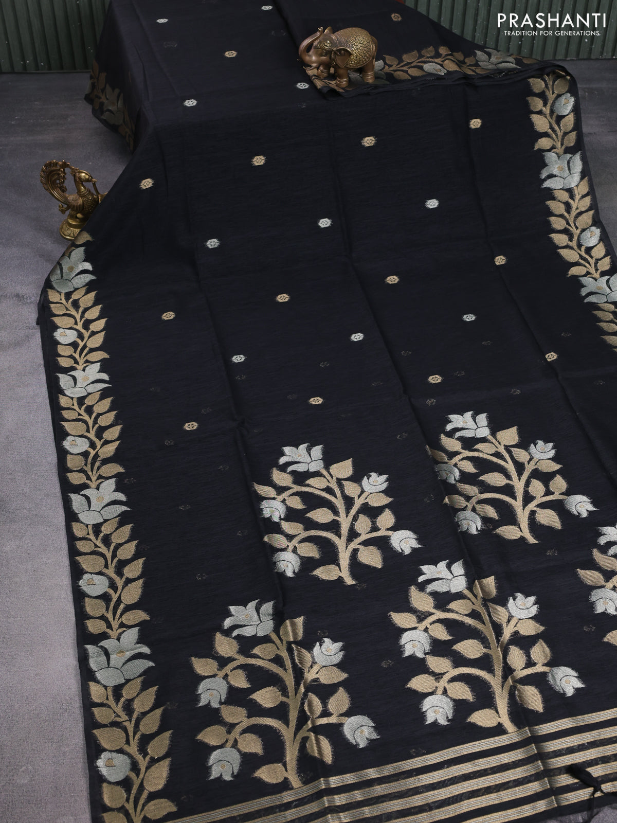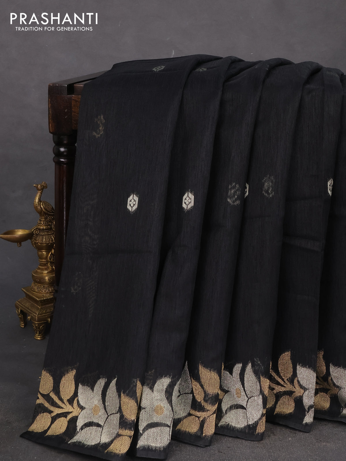 Jute linen saree black with zari woven buttas and floral zari woven border