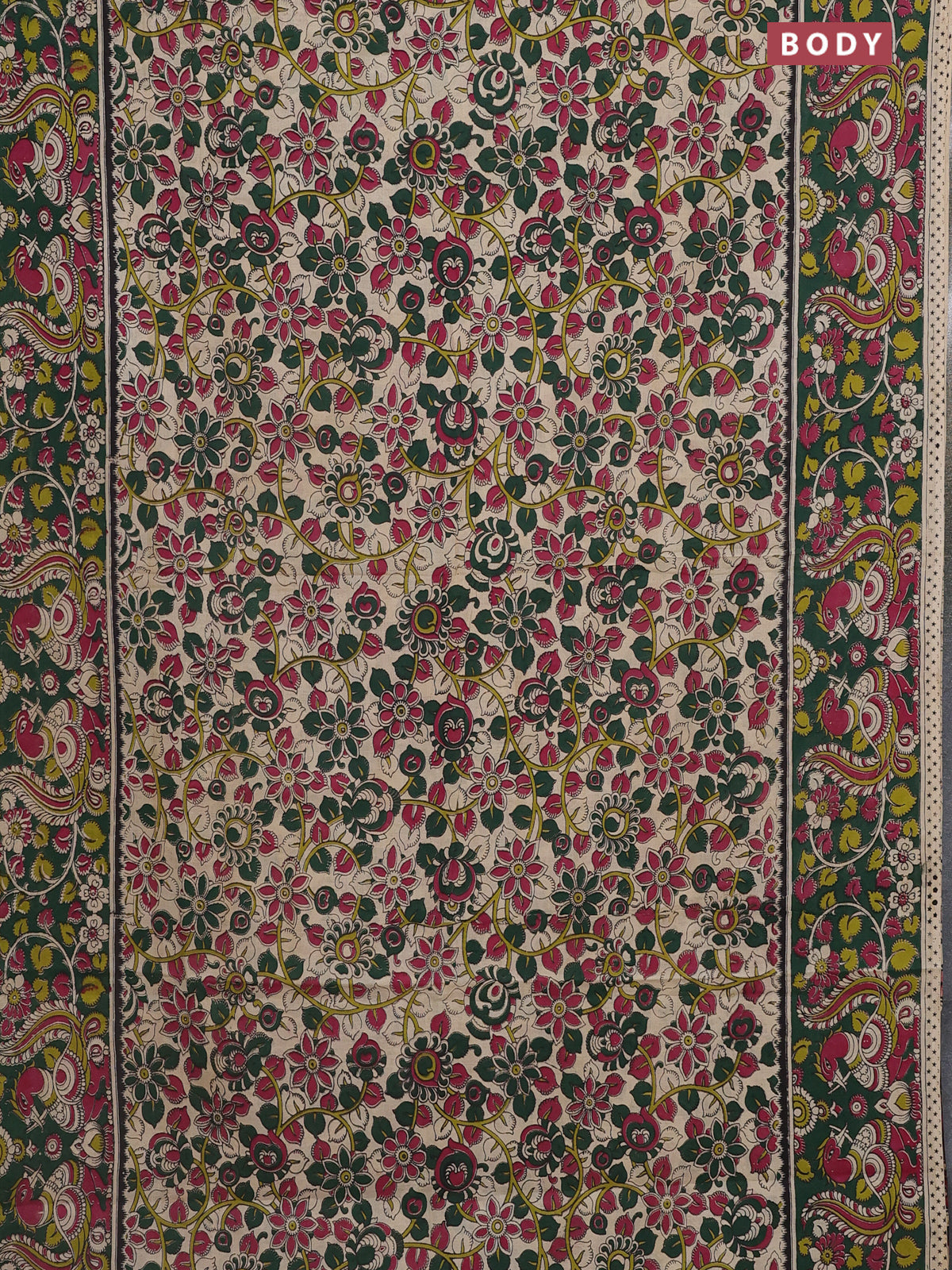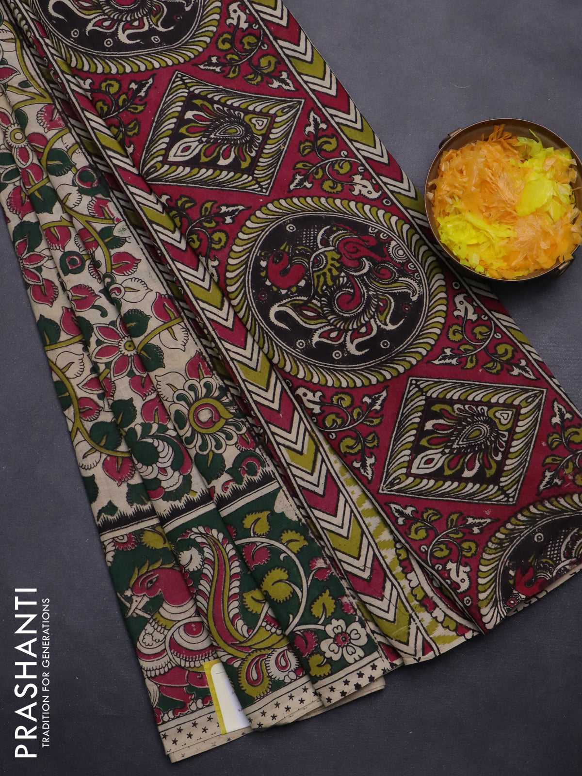 Kalamkari cotton saree beige and dark green with allover prints and printed border