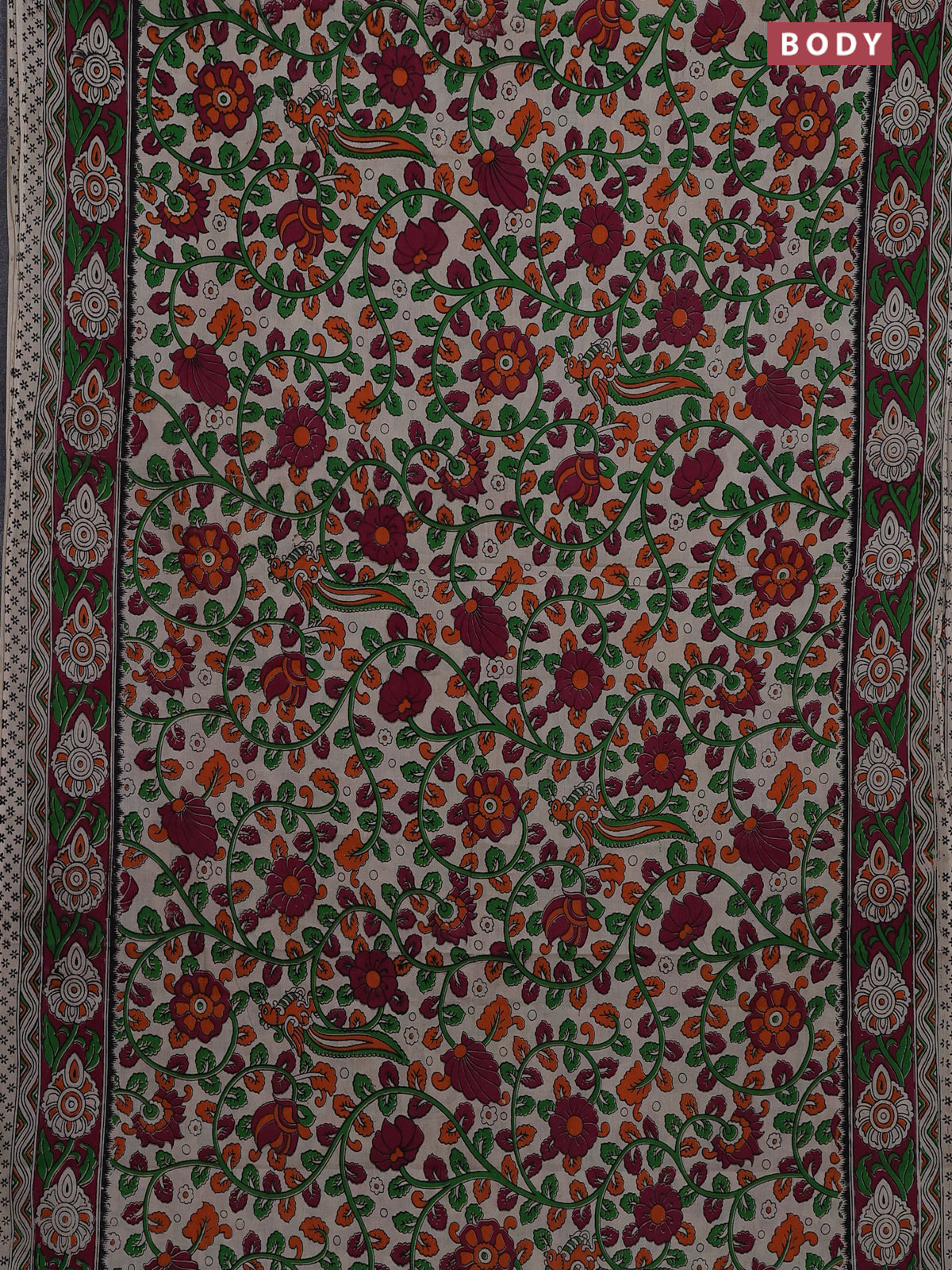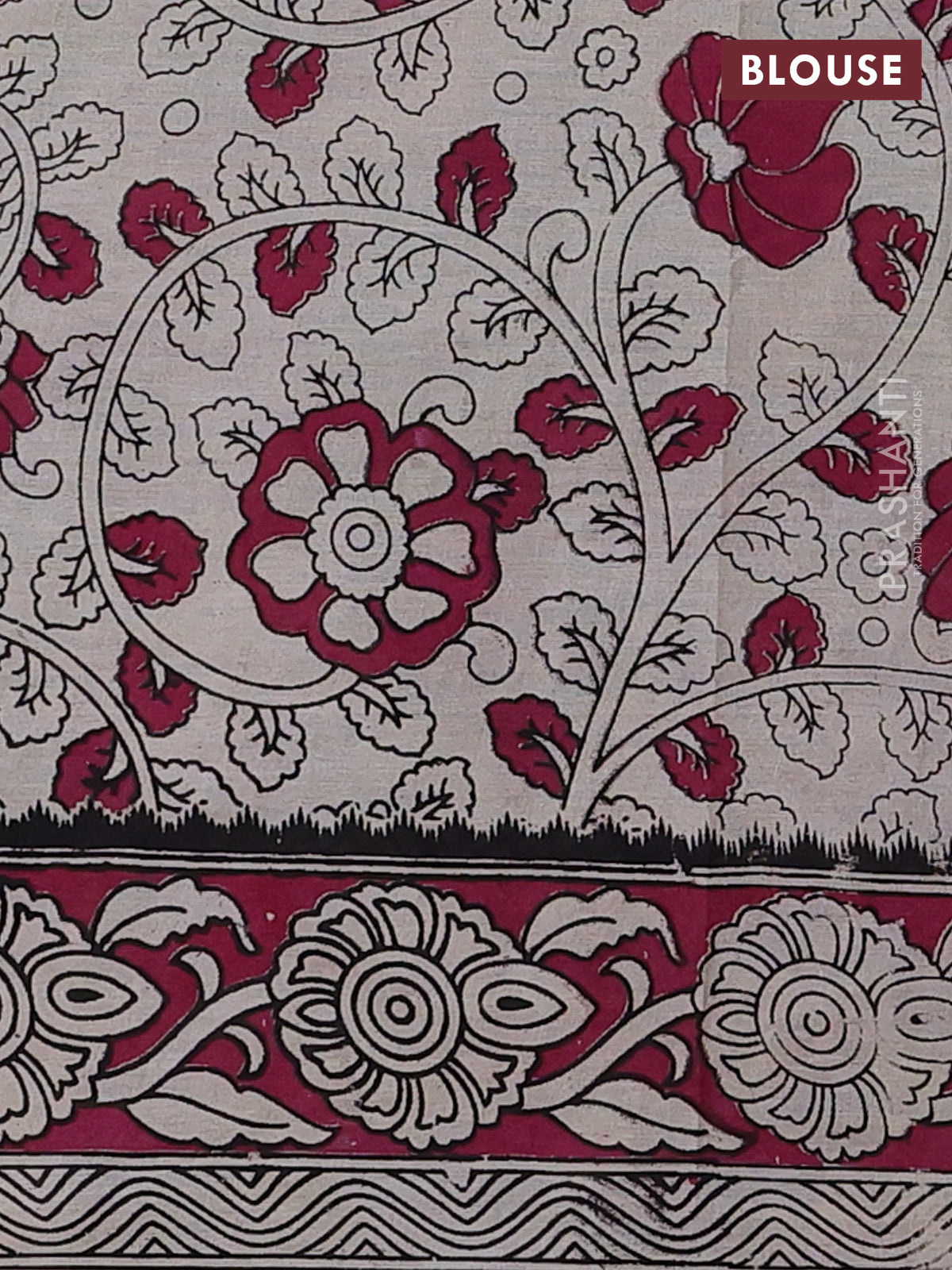 Kalamkari cotton saree beige and dark magenta pink with allover prints and printed border