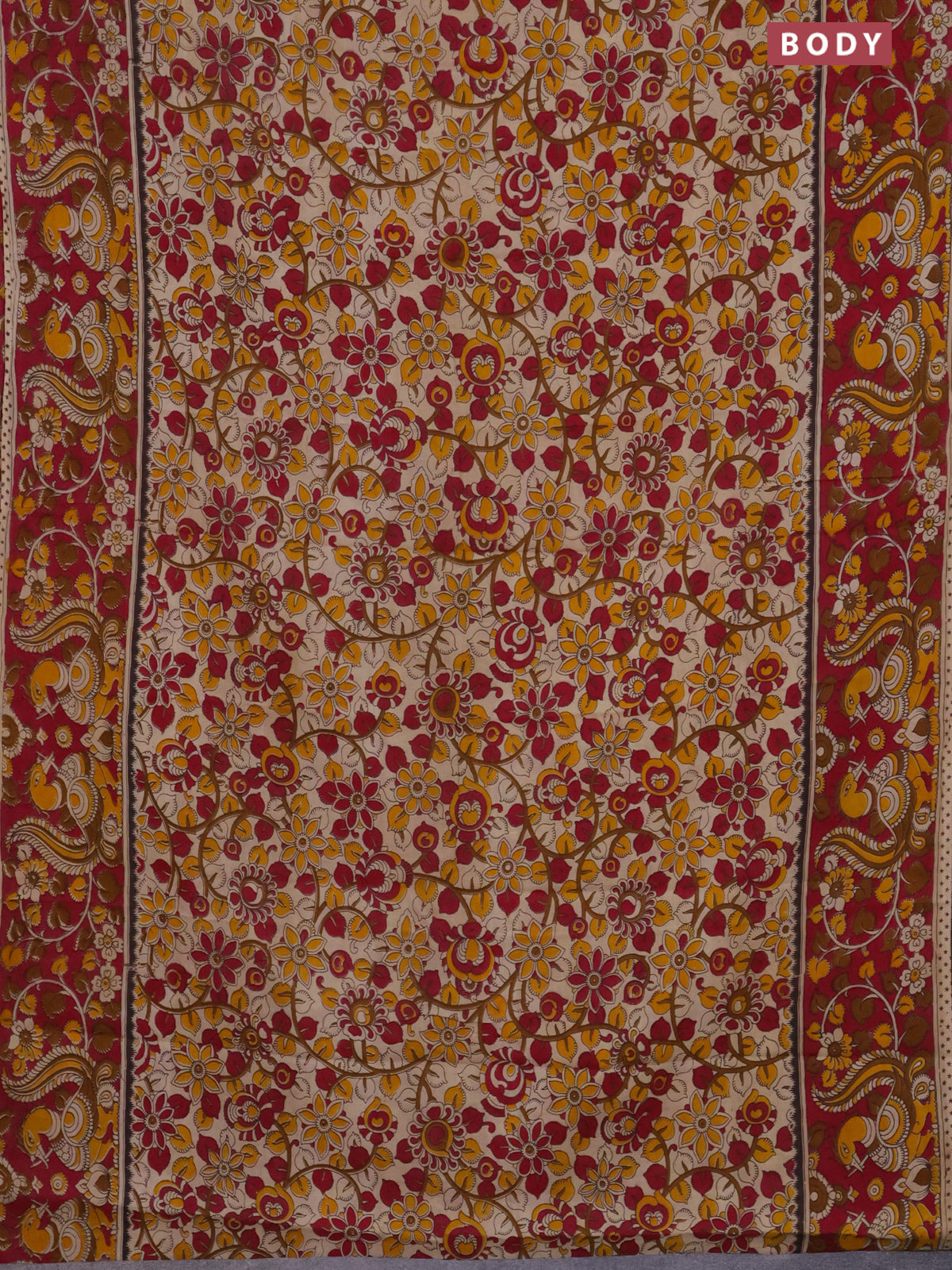 Kalamkari cotton saree beige and dark pink with allover prints and printed border