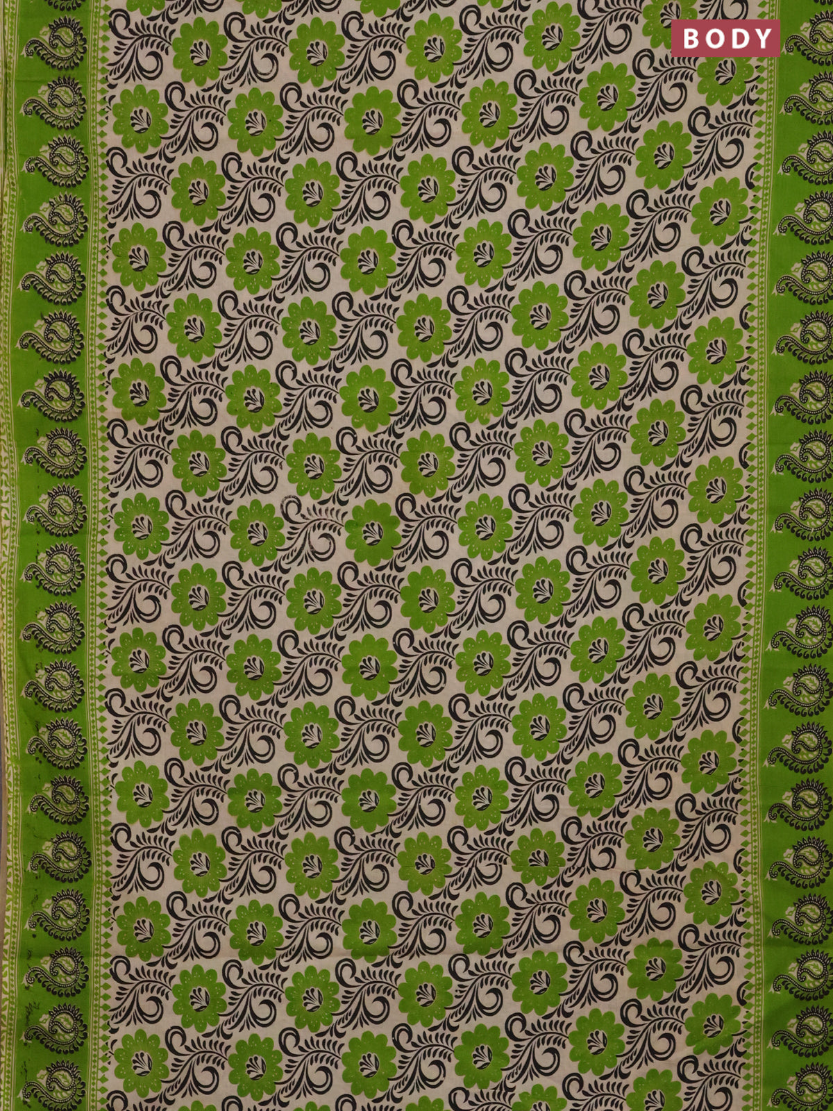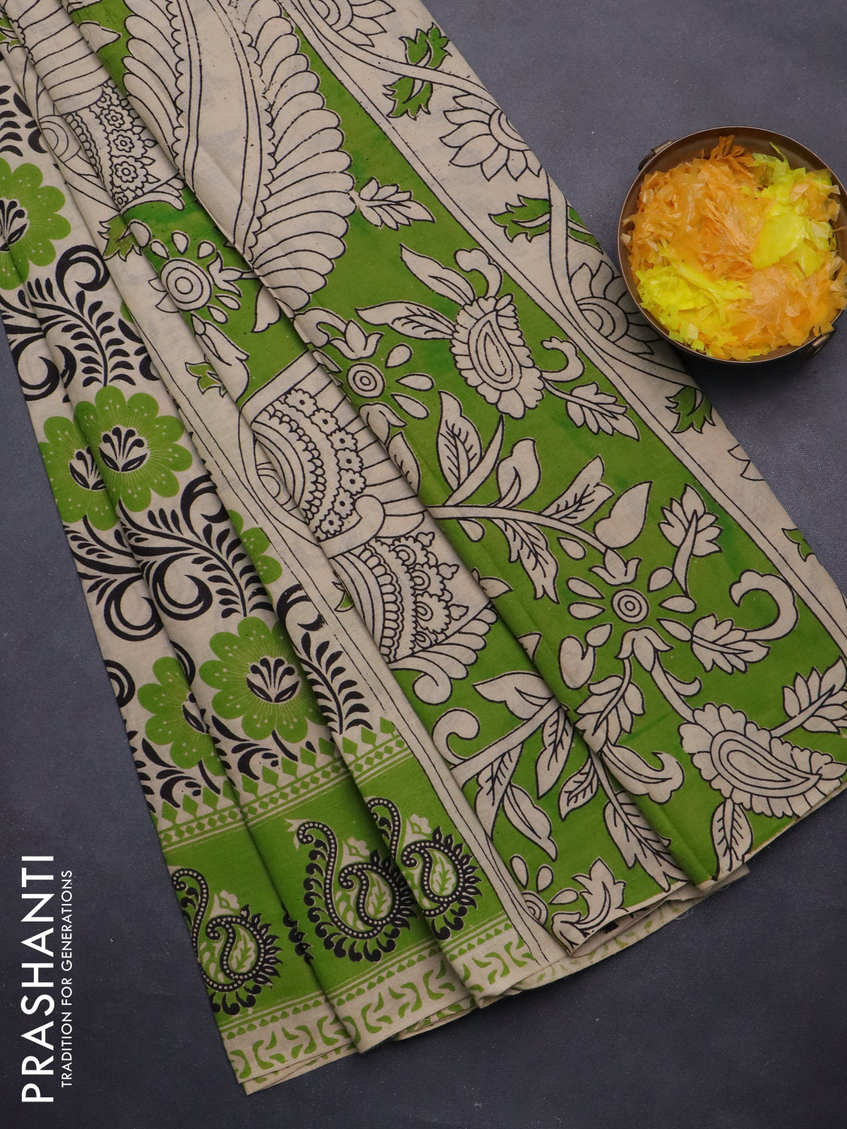 Kalamkari cotton saree beige and green with allover prints and printed border