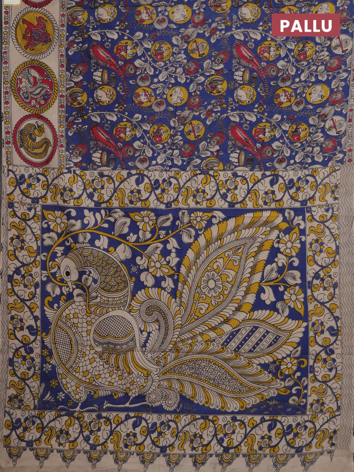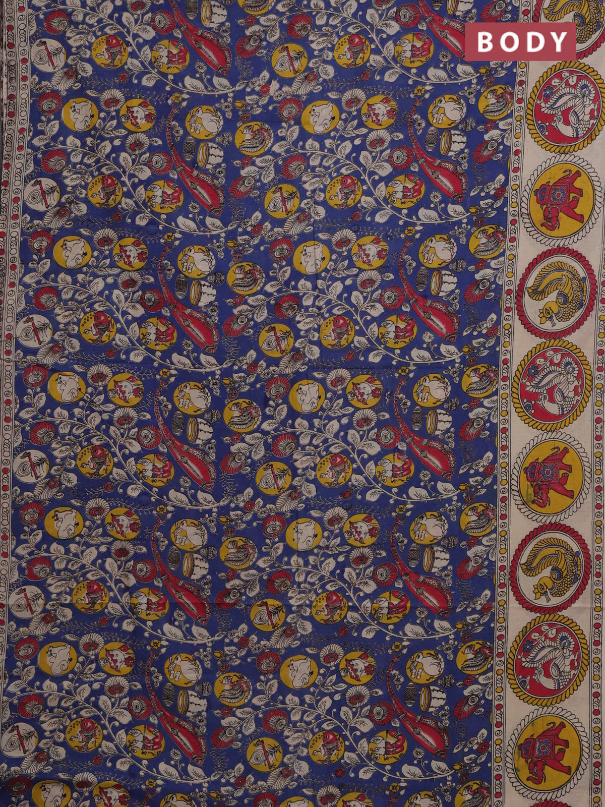 Kalamkari cotton saree blue and beige with allover prints and printed border