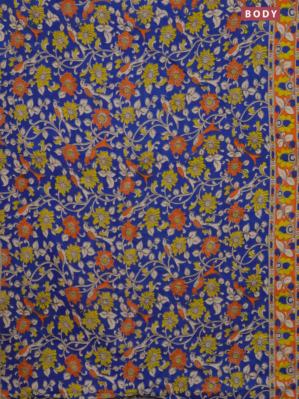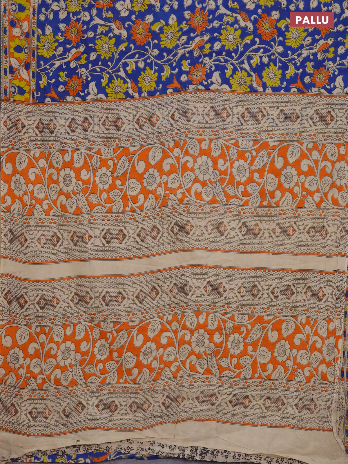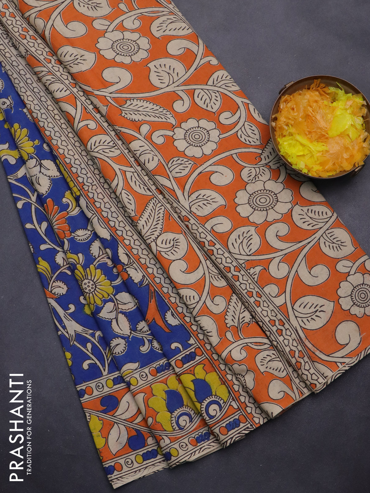 Kalamkari cotton saree blue and orange with allover prints and printed border