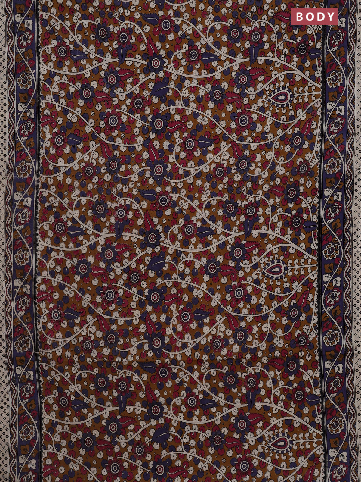 Kalamkari cotton saree dark mustard and blue shade with allover prints and printed border