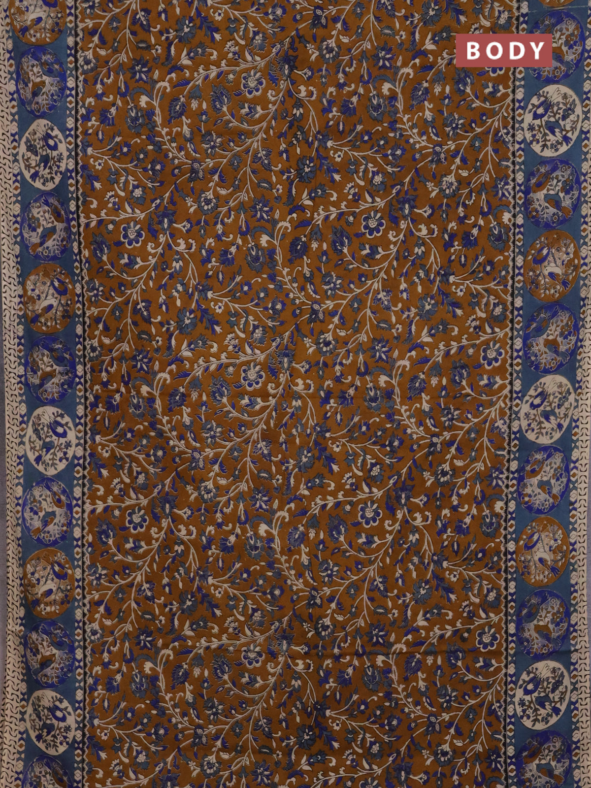 Kalamkari cotton saree dark mustard and greyish blue with allover prints and printed border