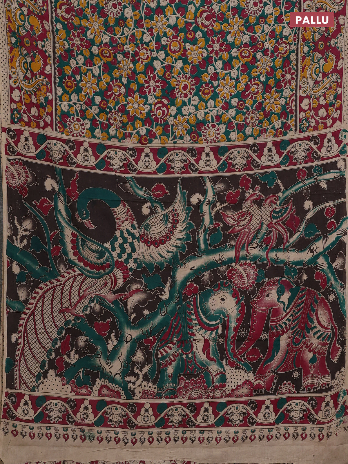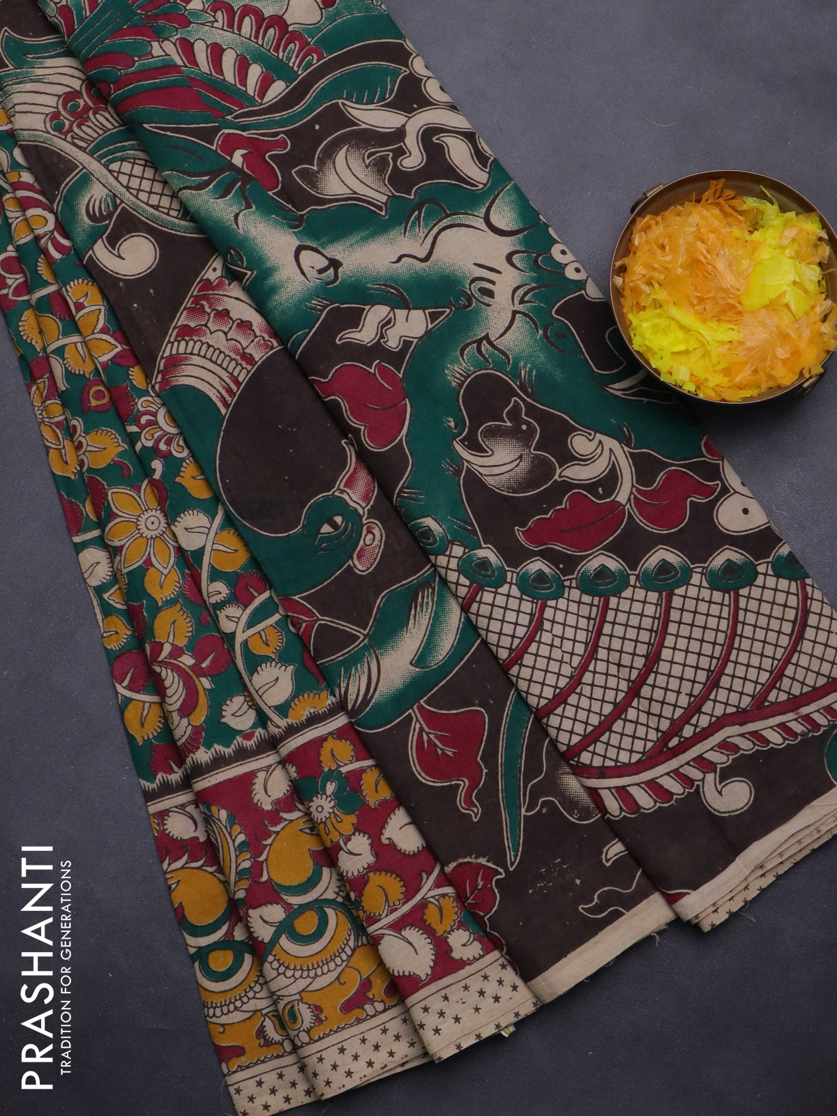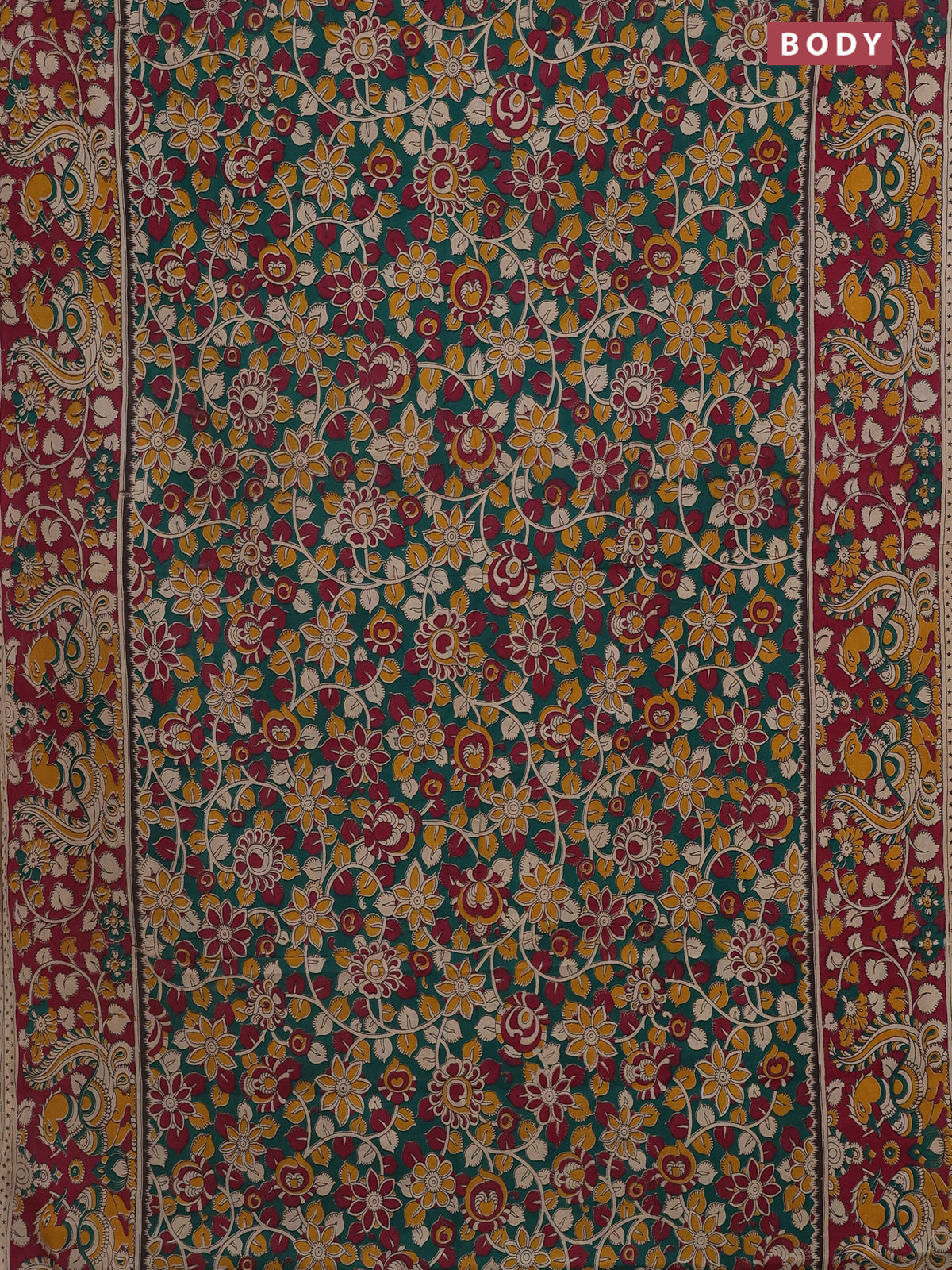 Kalamkari cotton saree green and dark pink with allover prints and printed border