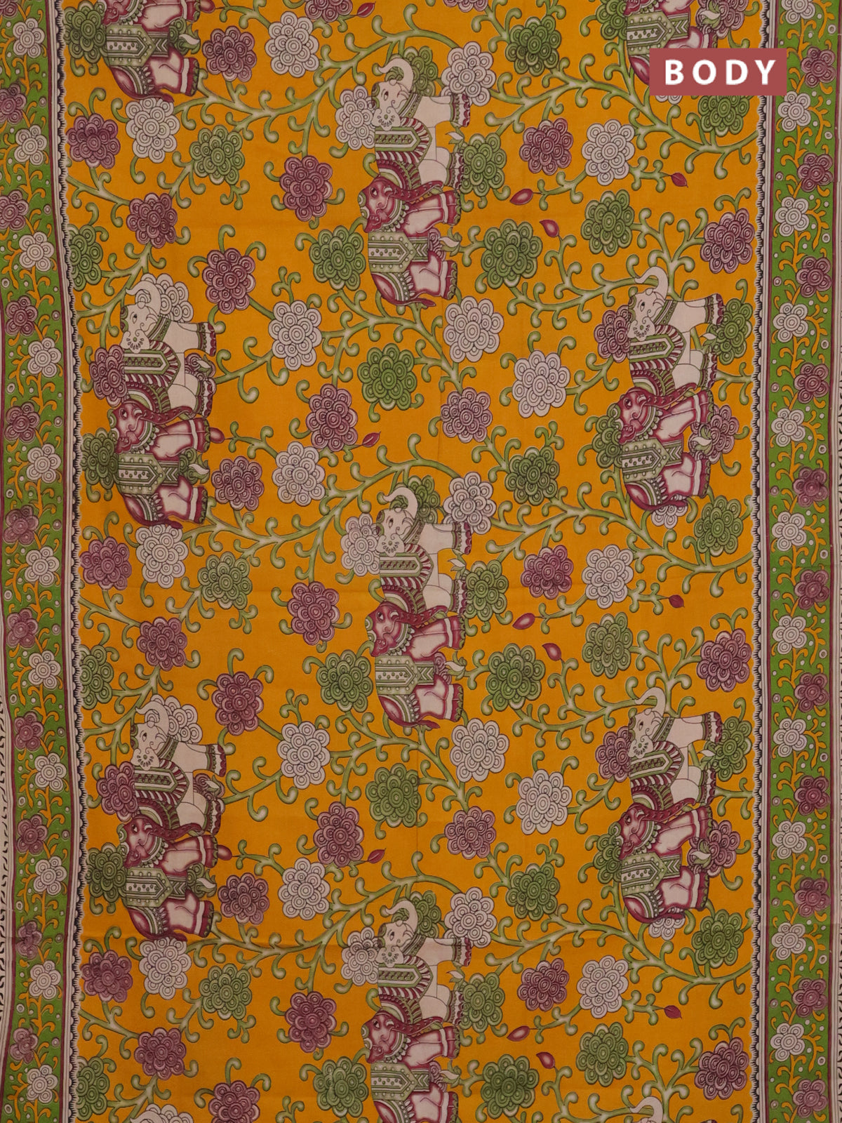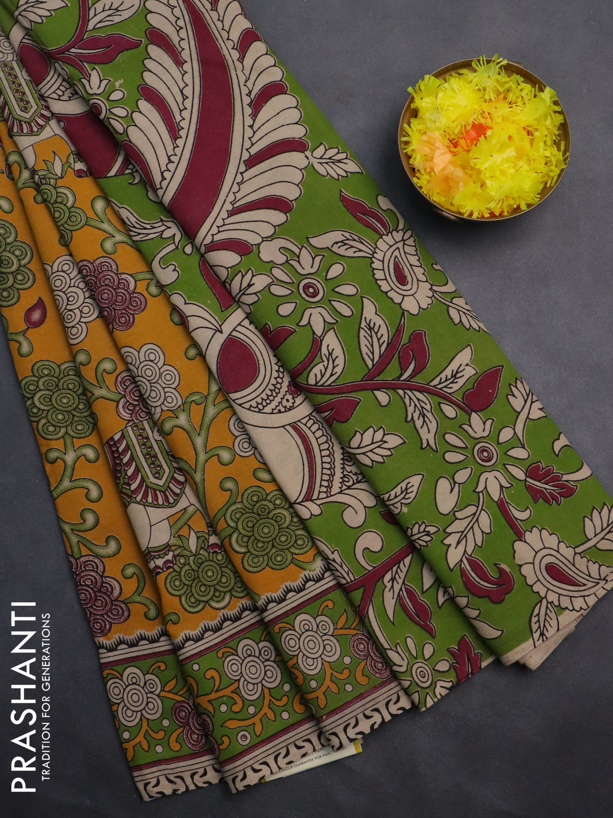 Kalamkari cotton saree mango yellow and sap green with allover prints and printed border