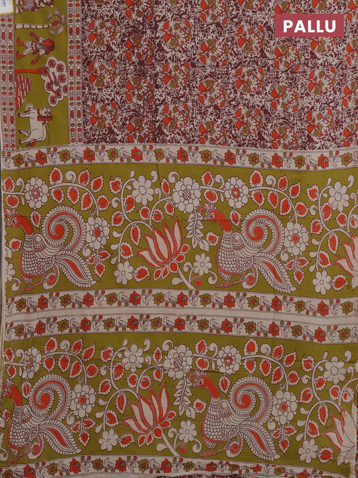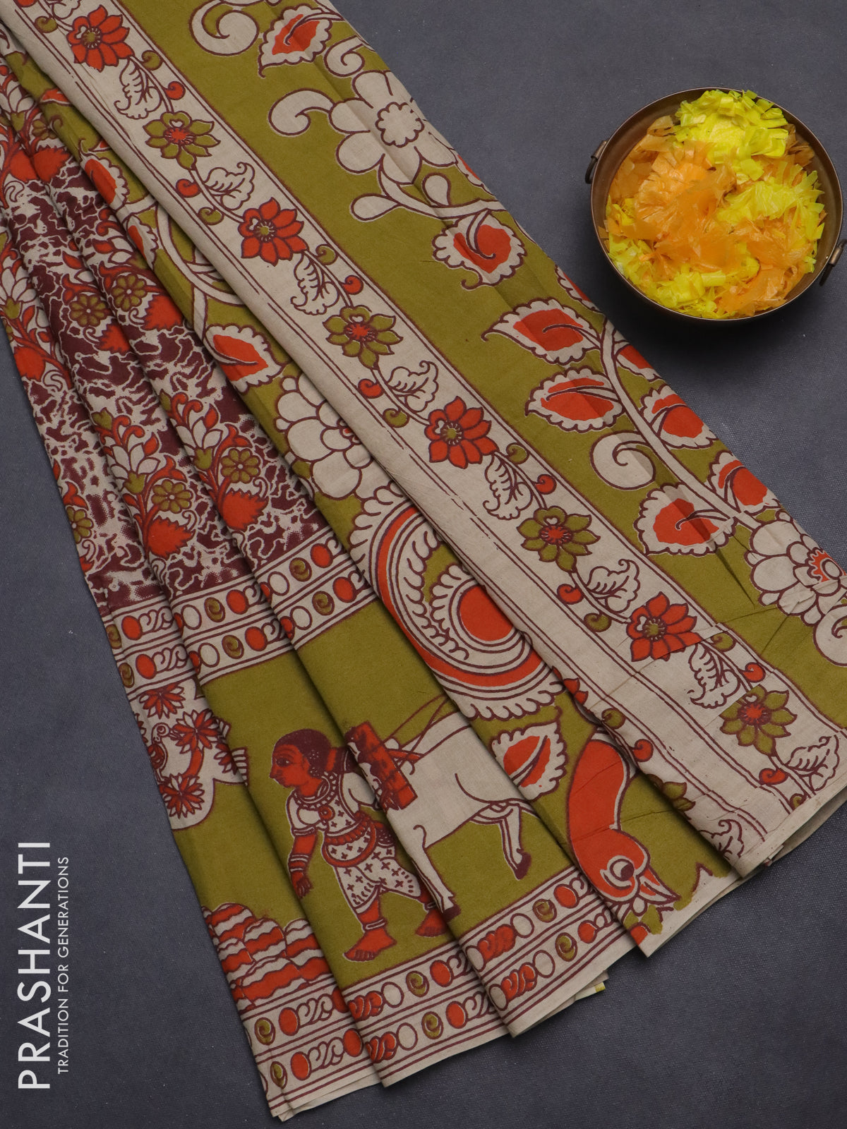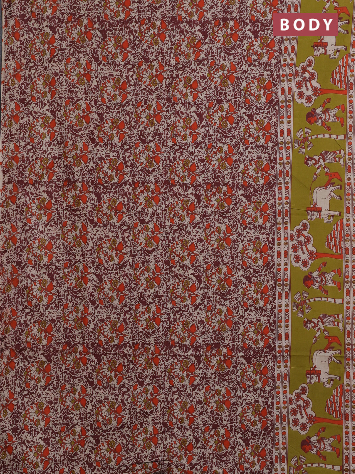 Kalamkari cotton saree maroon and mehendi green with allover prints and printed border
