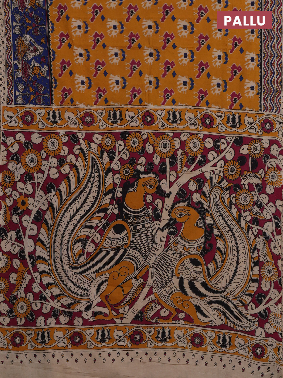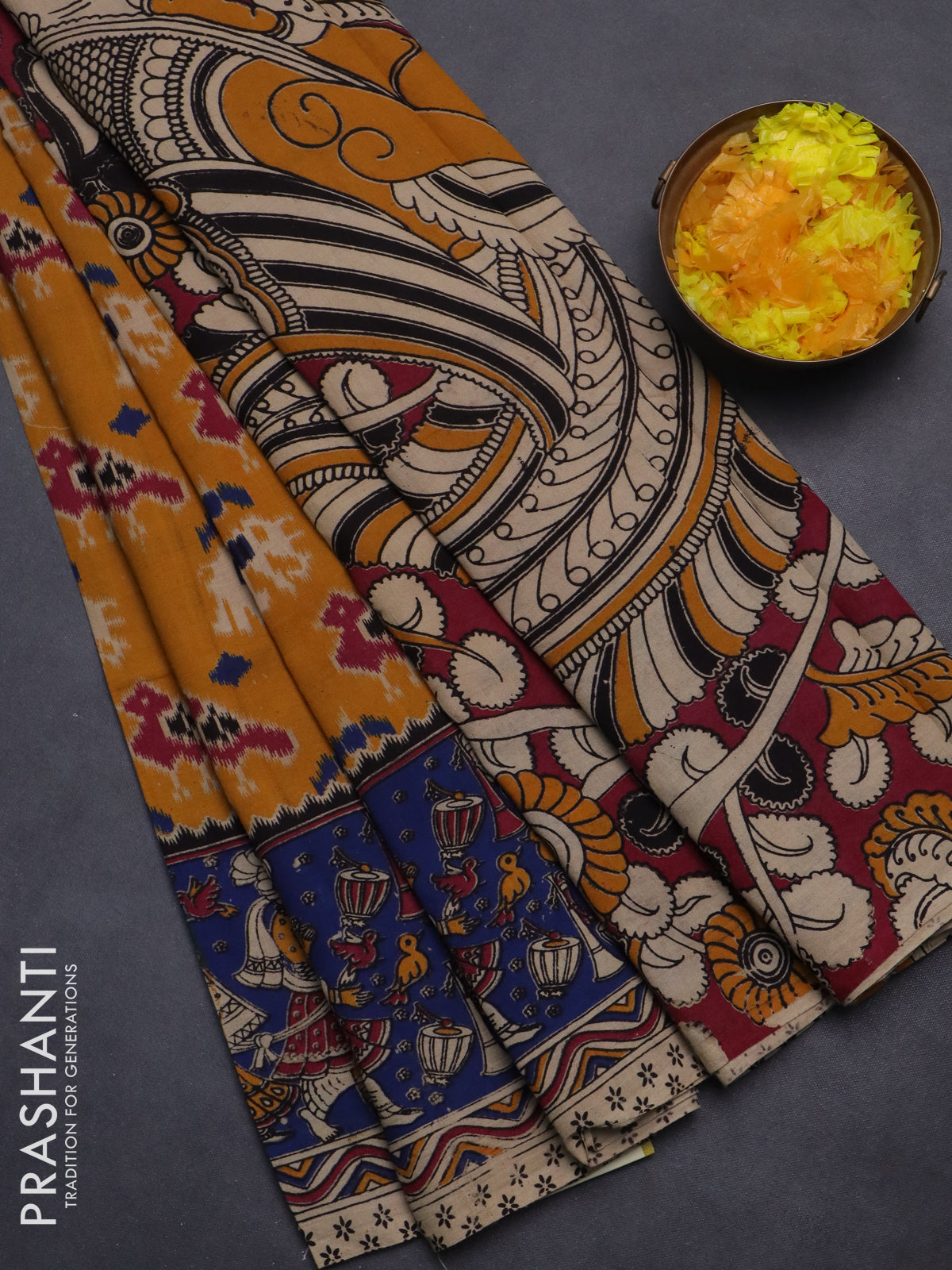 Kalamkari cotton saree mustard yellow and blue with allover ikat prints and printed border