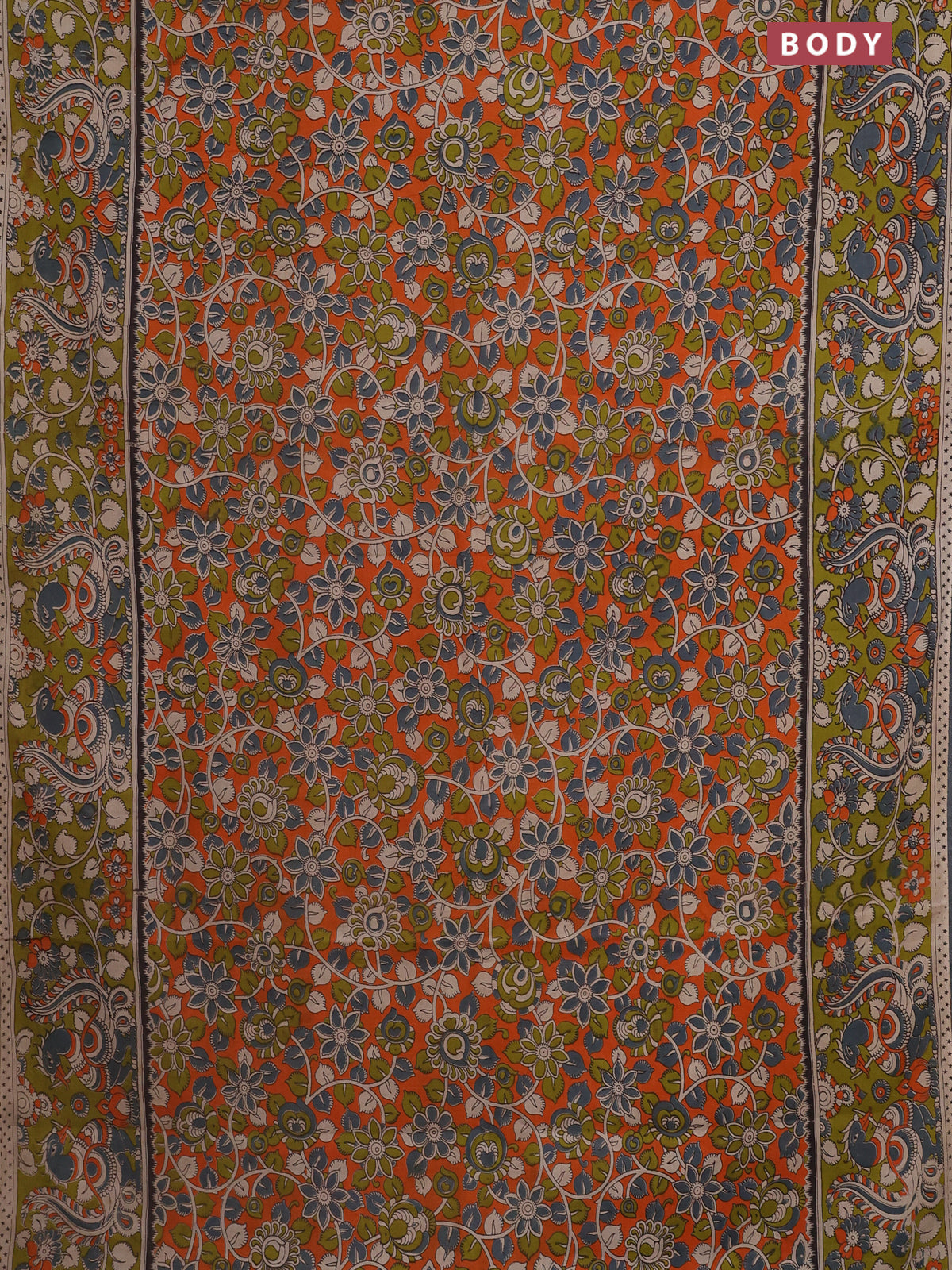 Kalamkari cotton saree orange and light green with allover prints and printed border