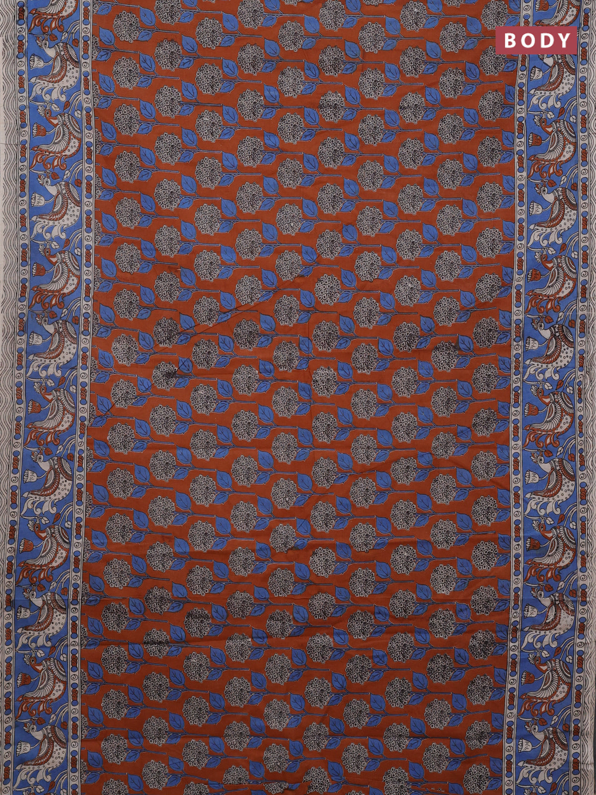 Kalamkari cotton saree rust shade and blue with allover prints and printed border