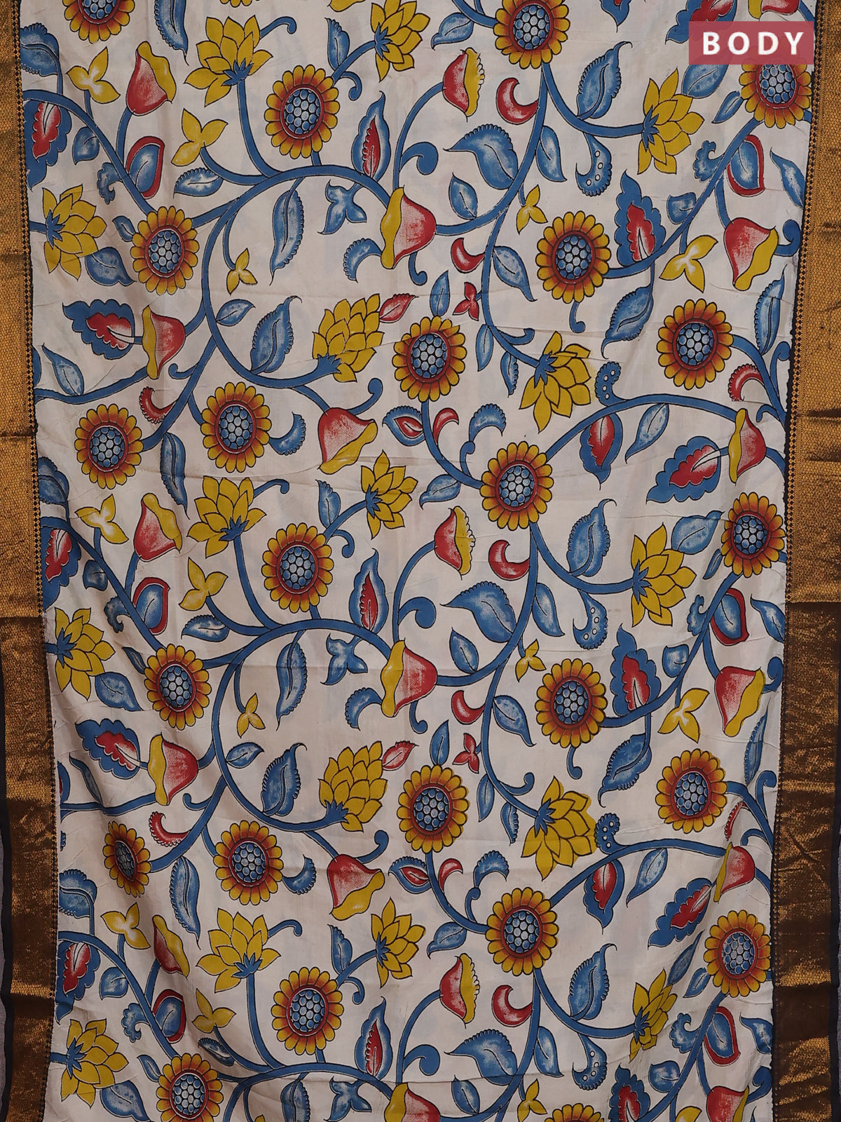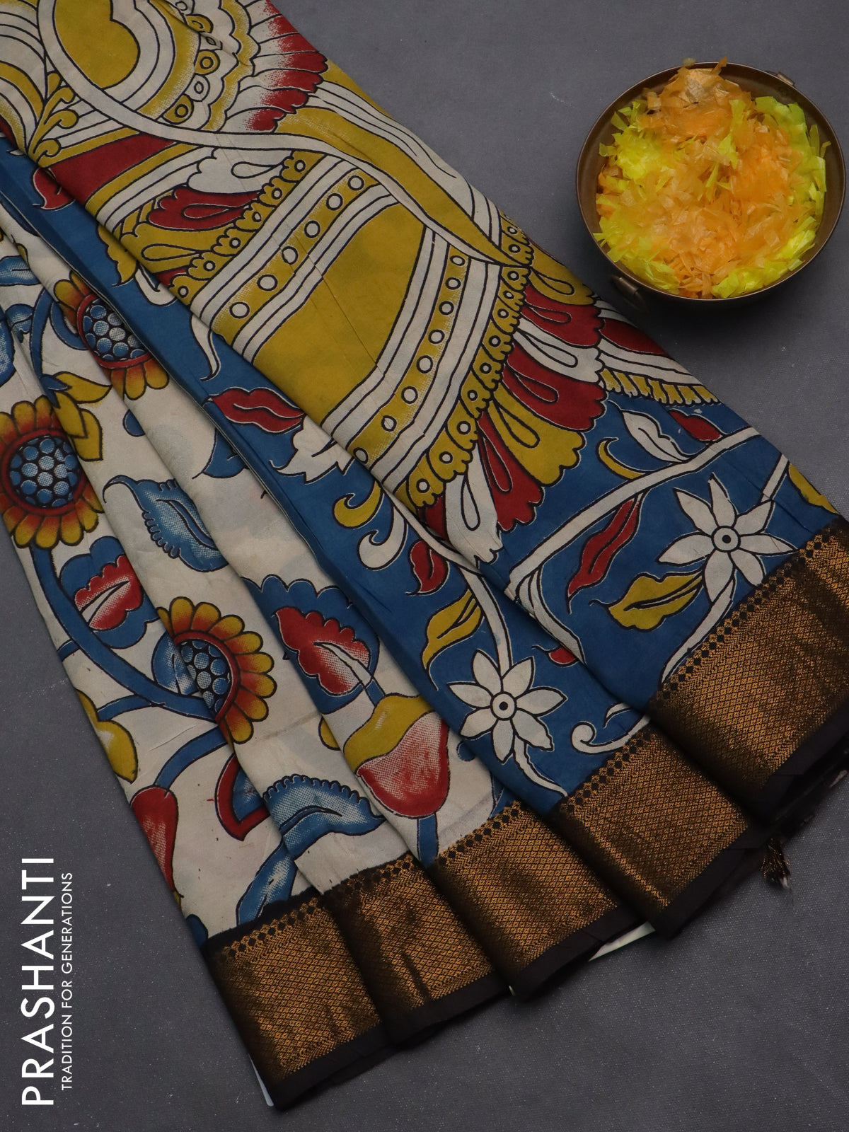 Kalamkari semi silk saree beige and black with allover prints and zari woven border