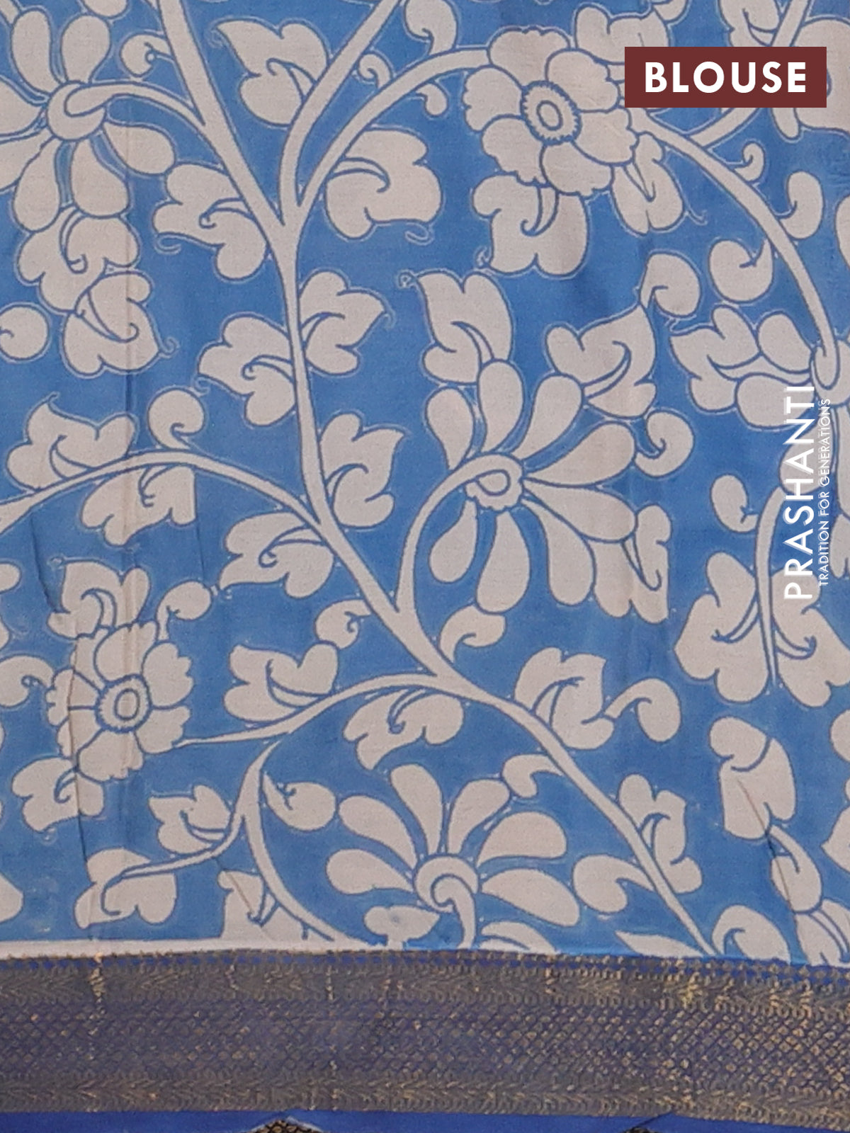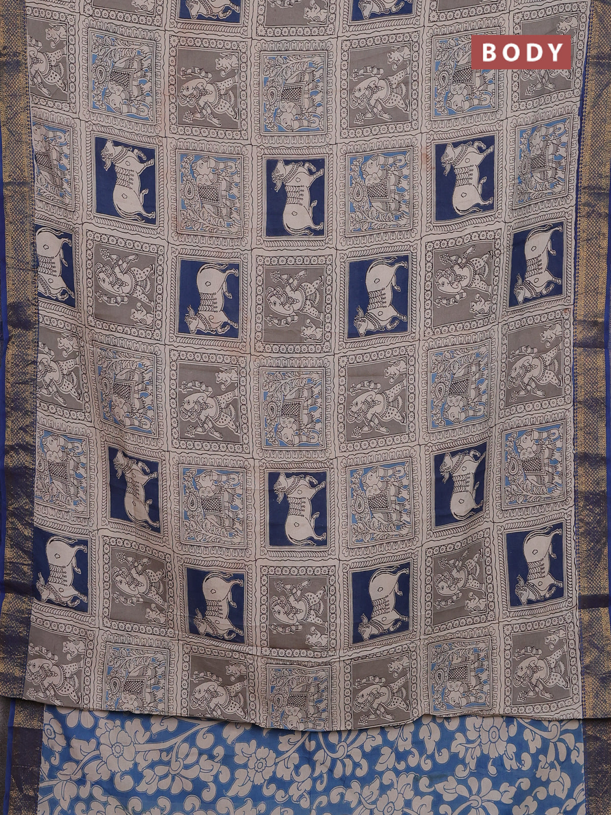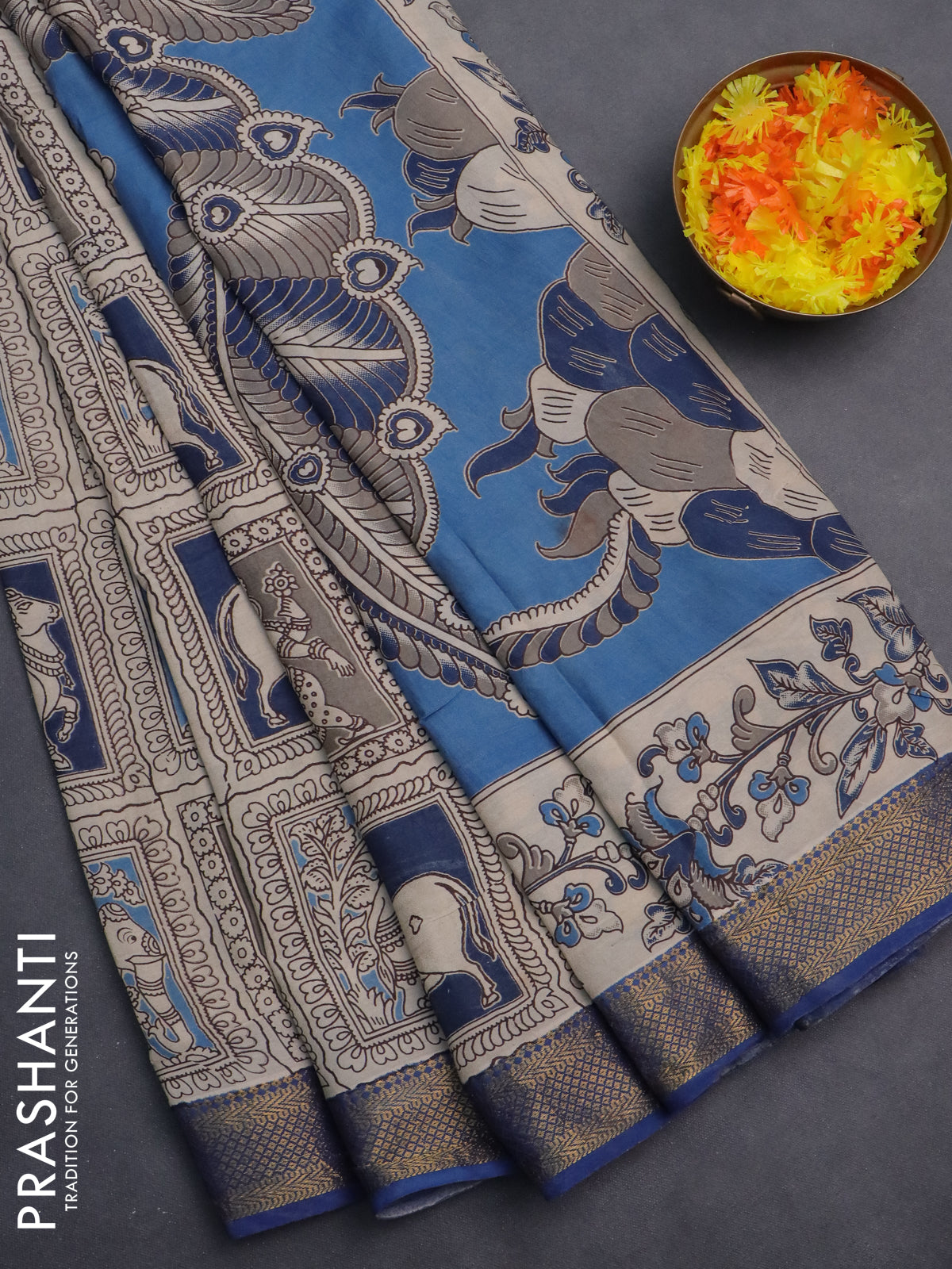 Kalamkari semi silk saree beige and blue with allover prints and zari woven border