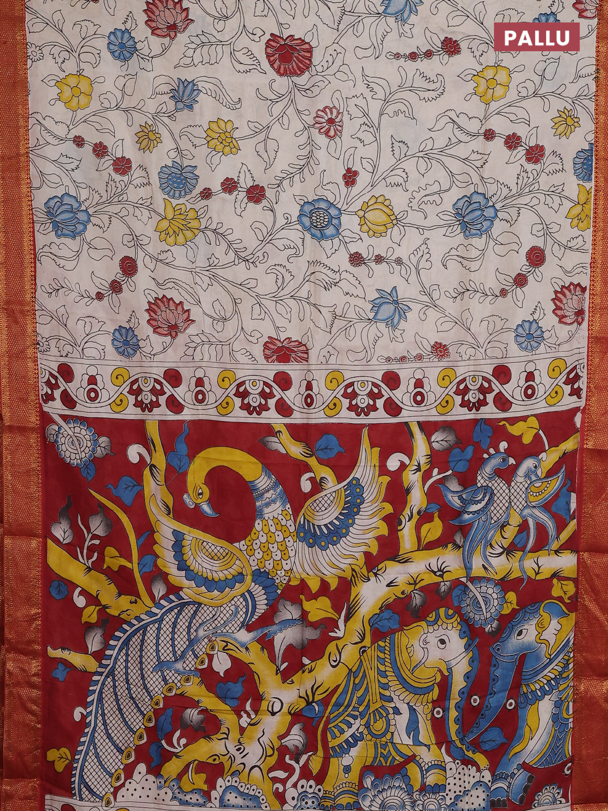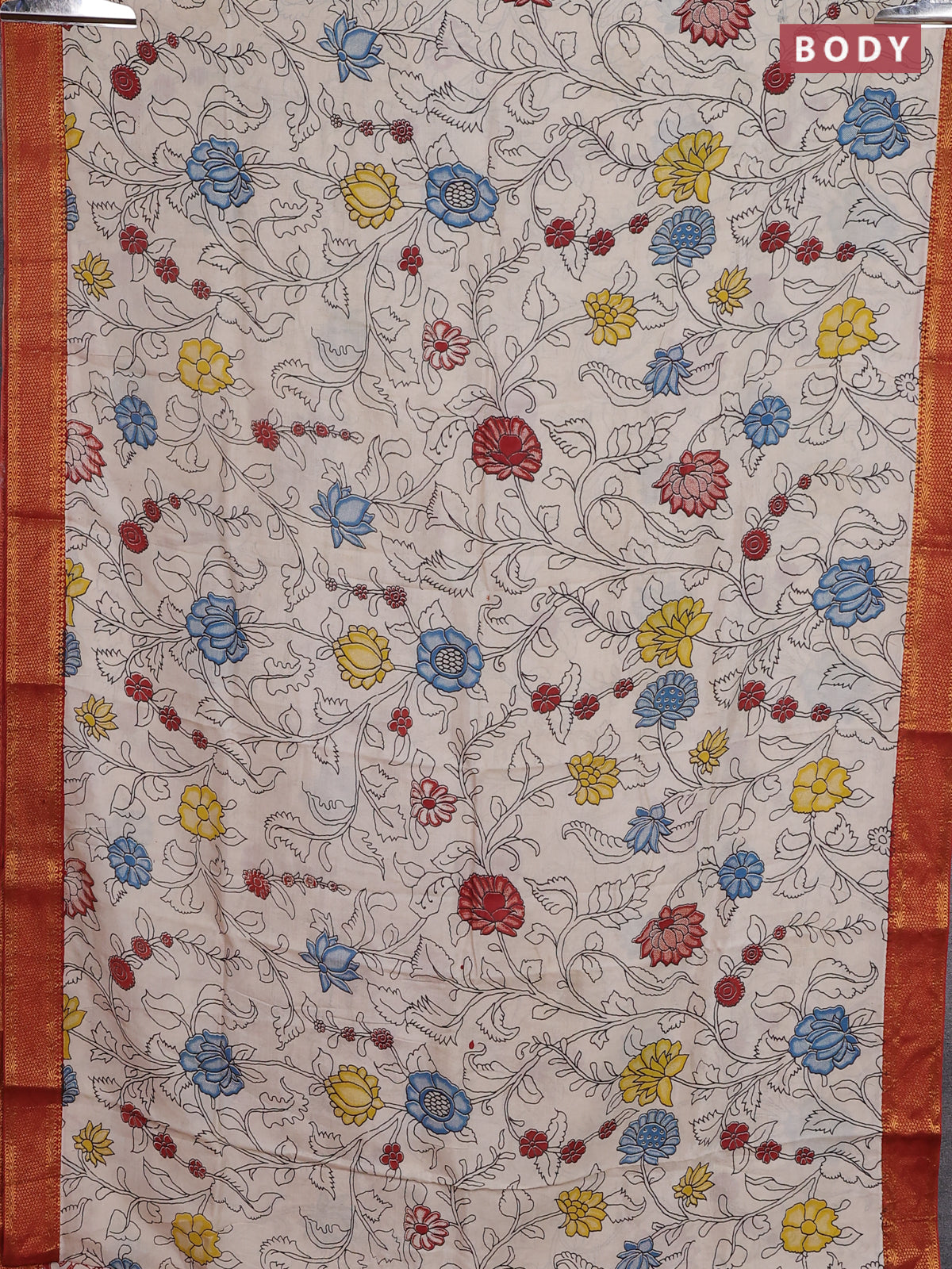 Kalamkari semi silk saree beige and rust shade with allover prints and zari woven border