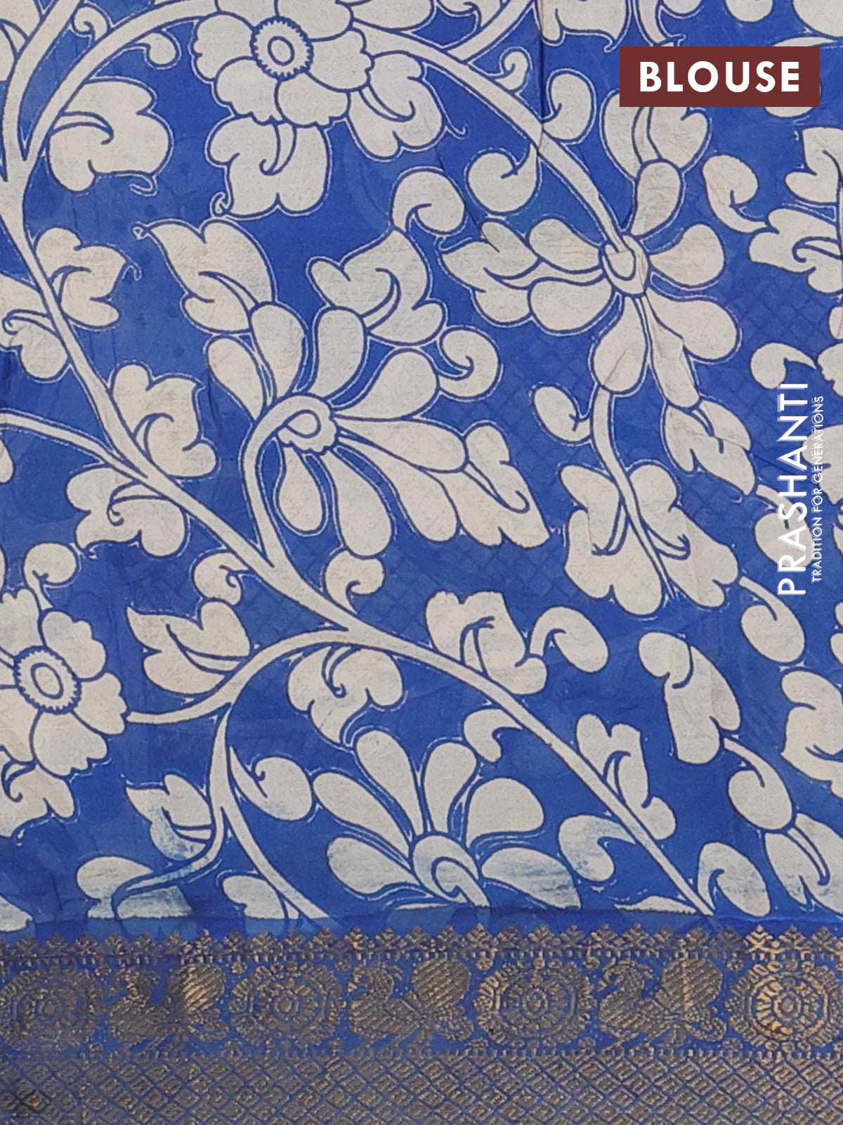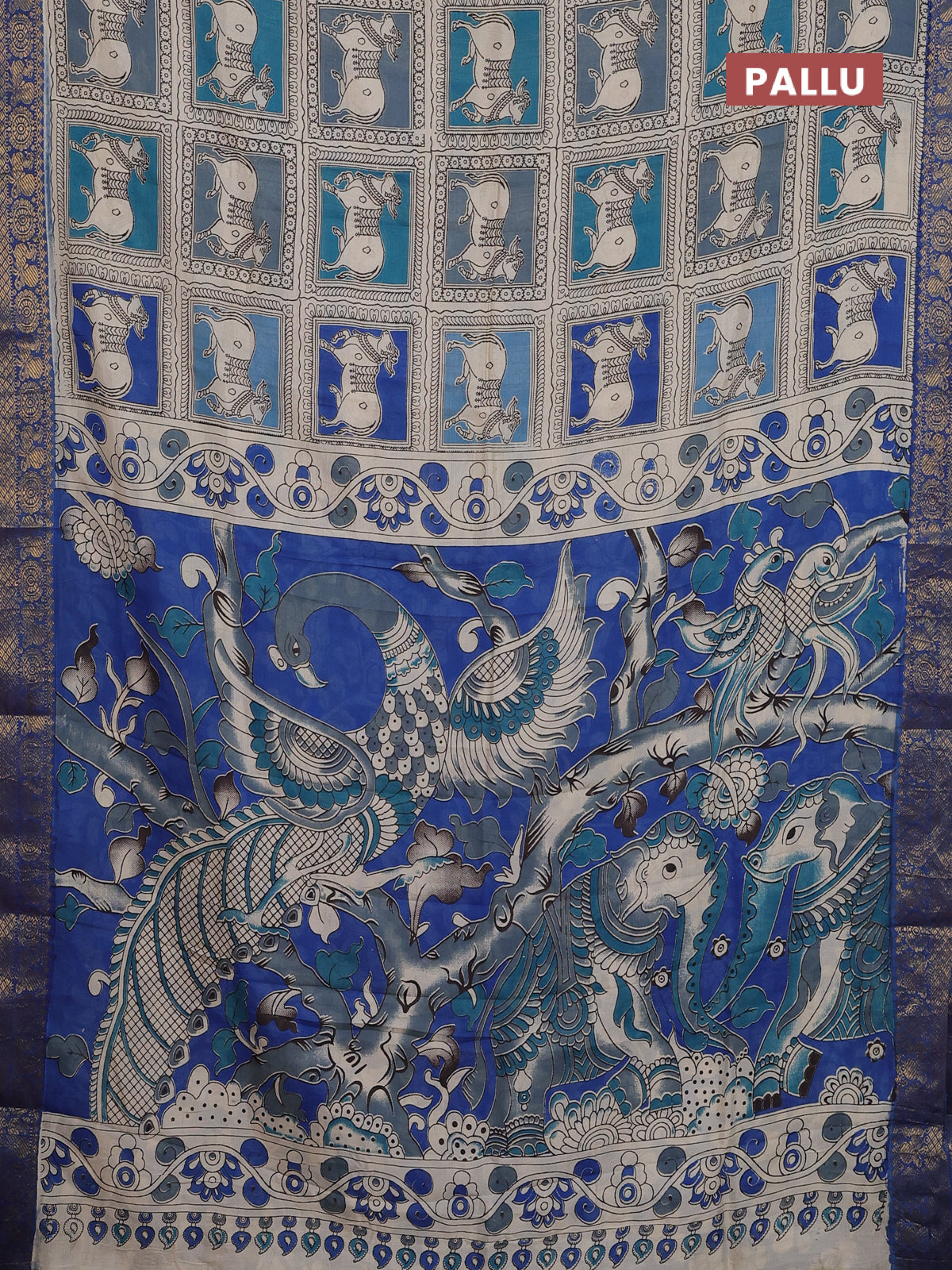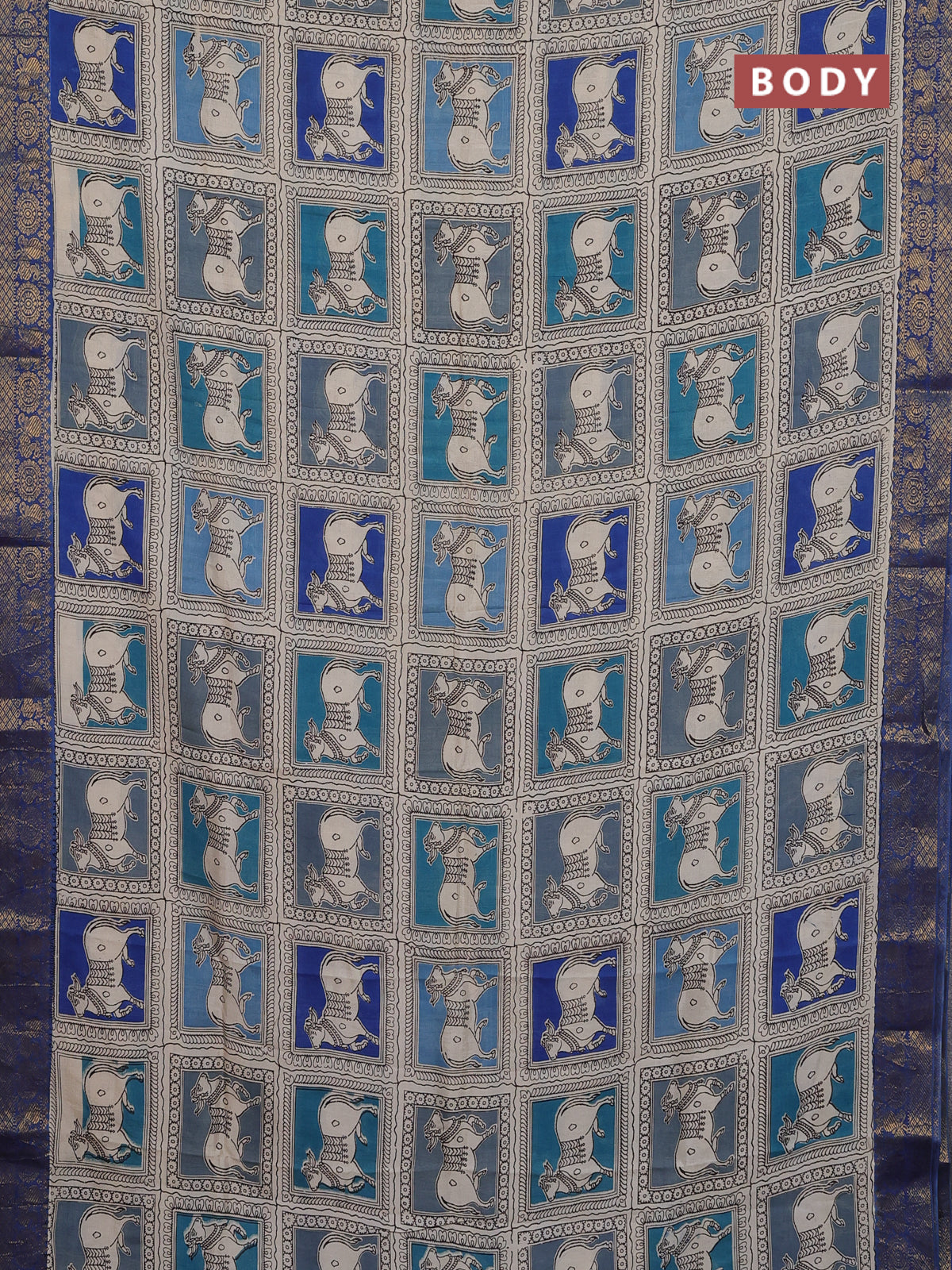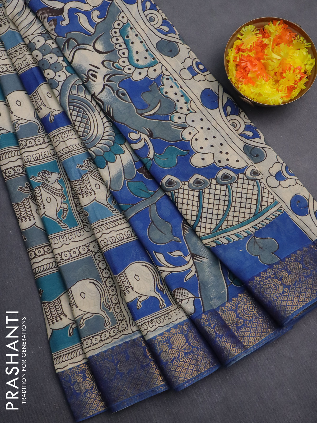 Kalamkari semi silk saree beige blue and multi colour with allover prints and zari woven border