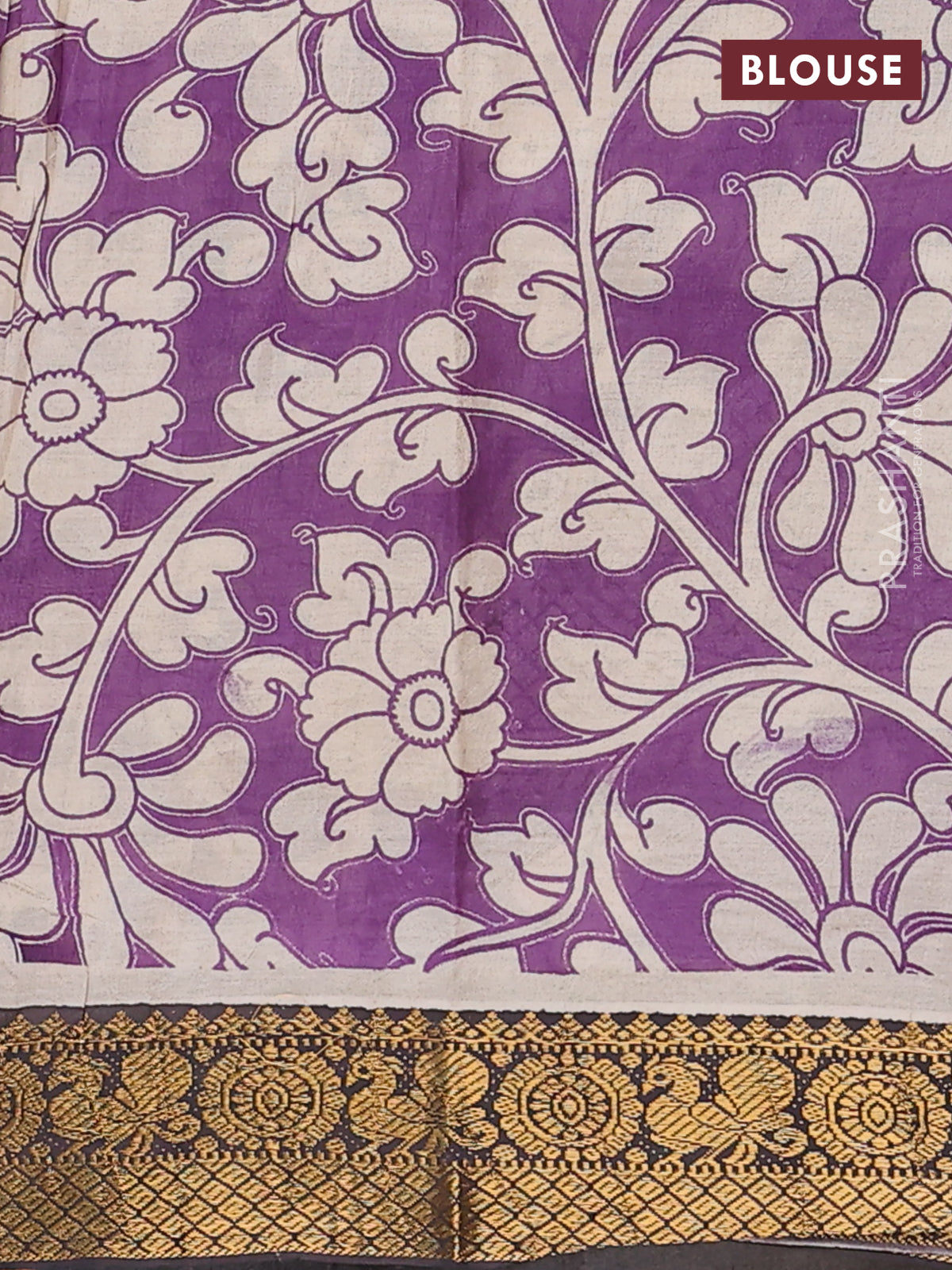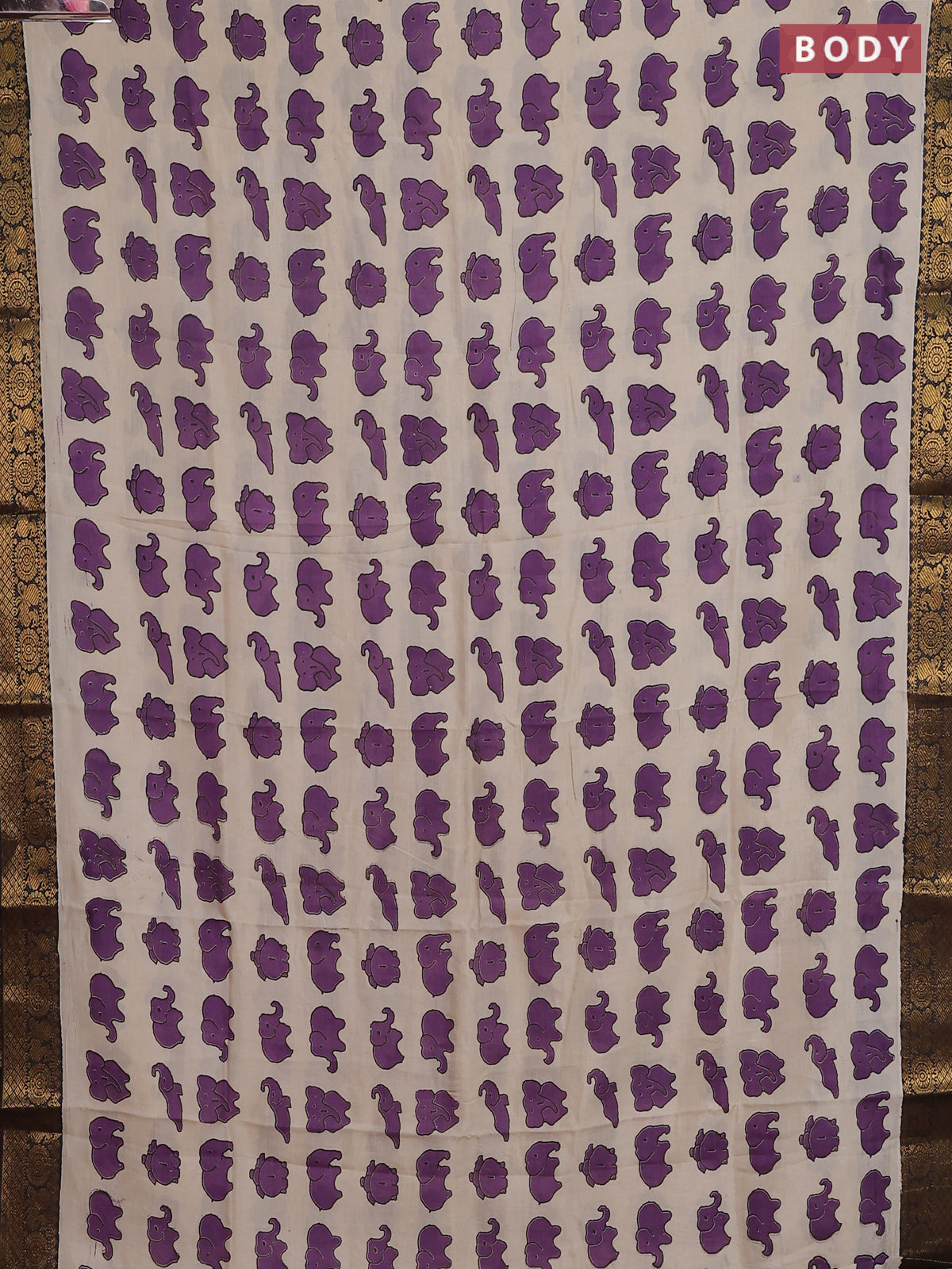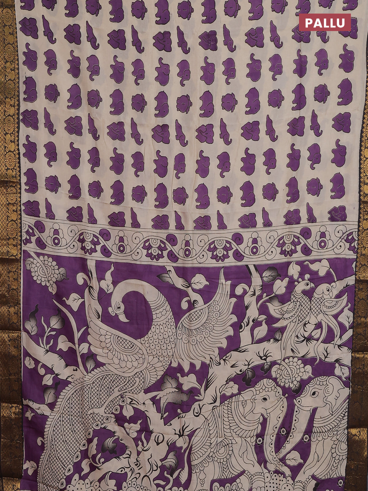 Kalamkari semi silk saree beige purple and black with allover elephant butta prints and zari woven border
