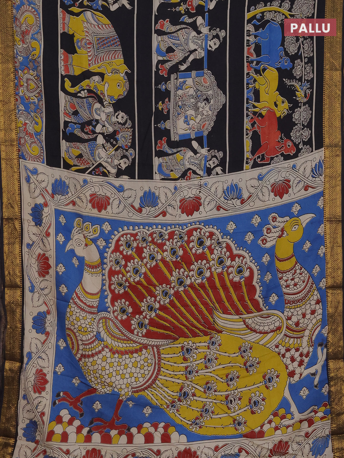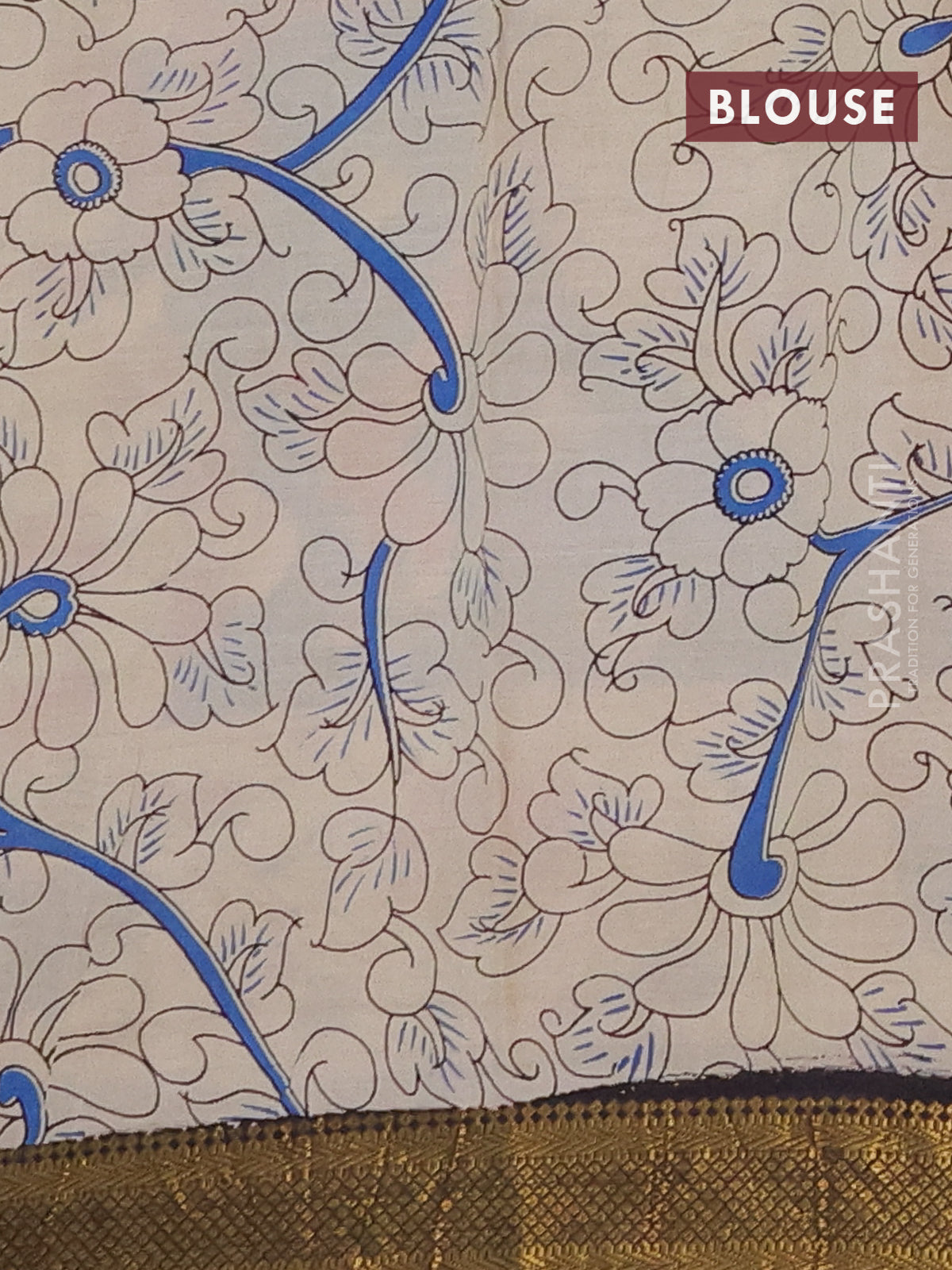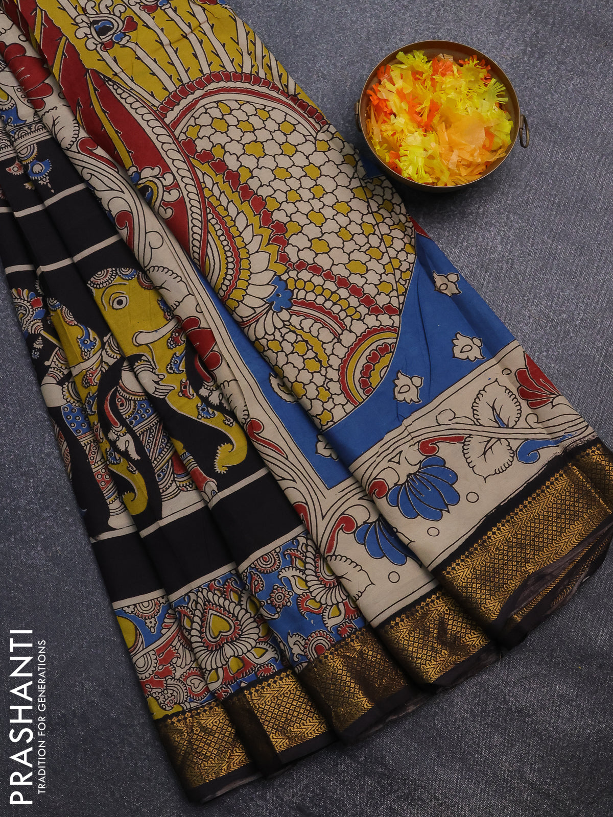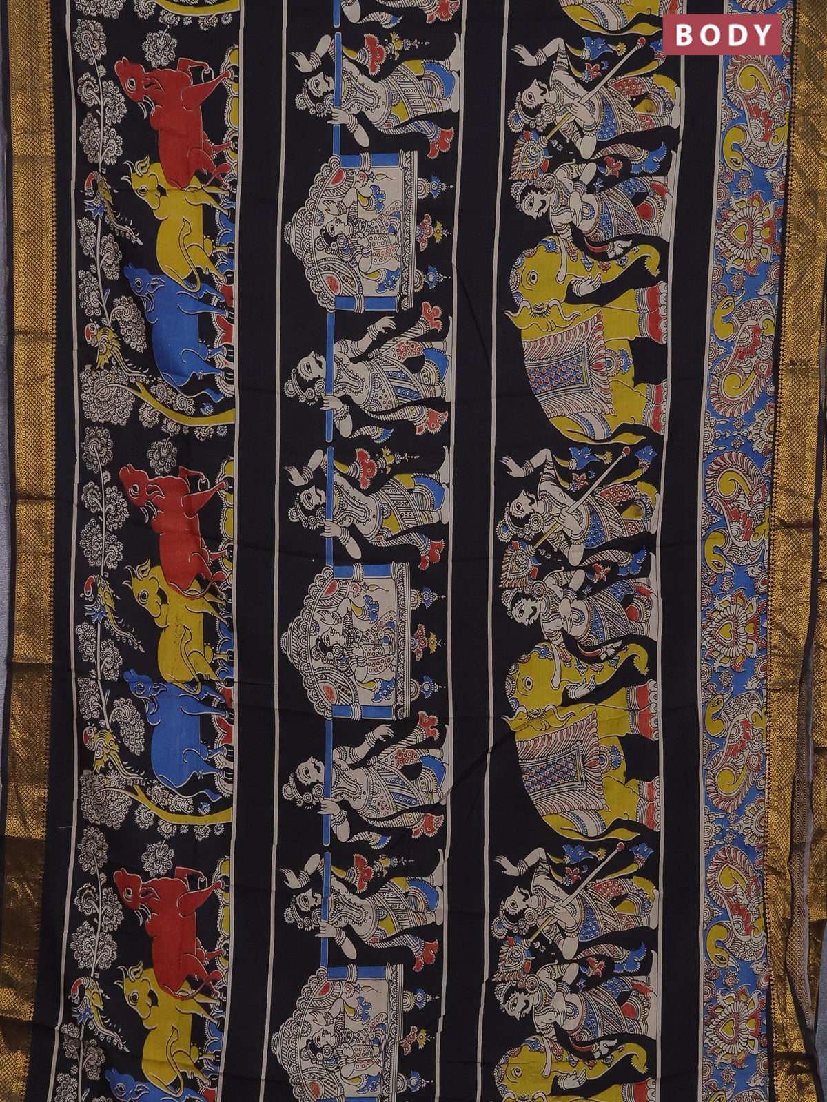 Kalamkari semi silk saree black and blue with allover prints and zari woven border