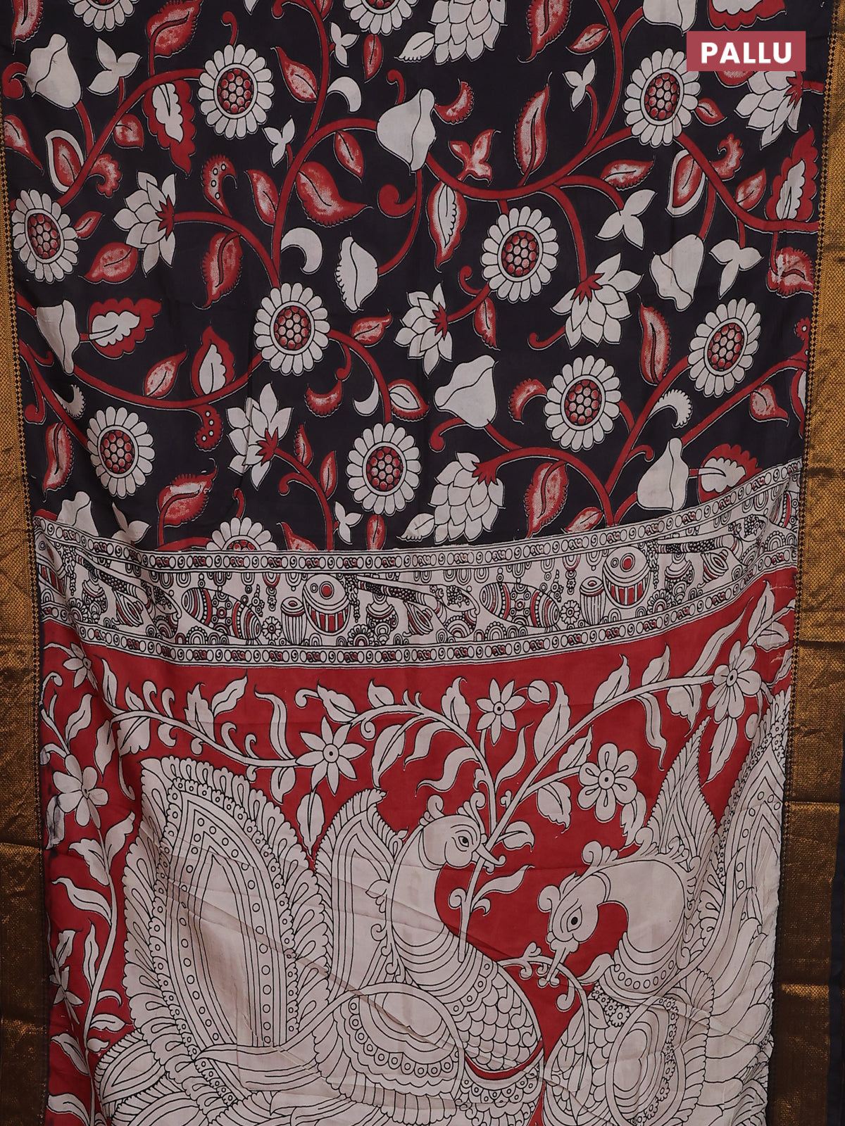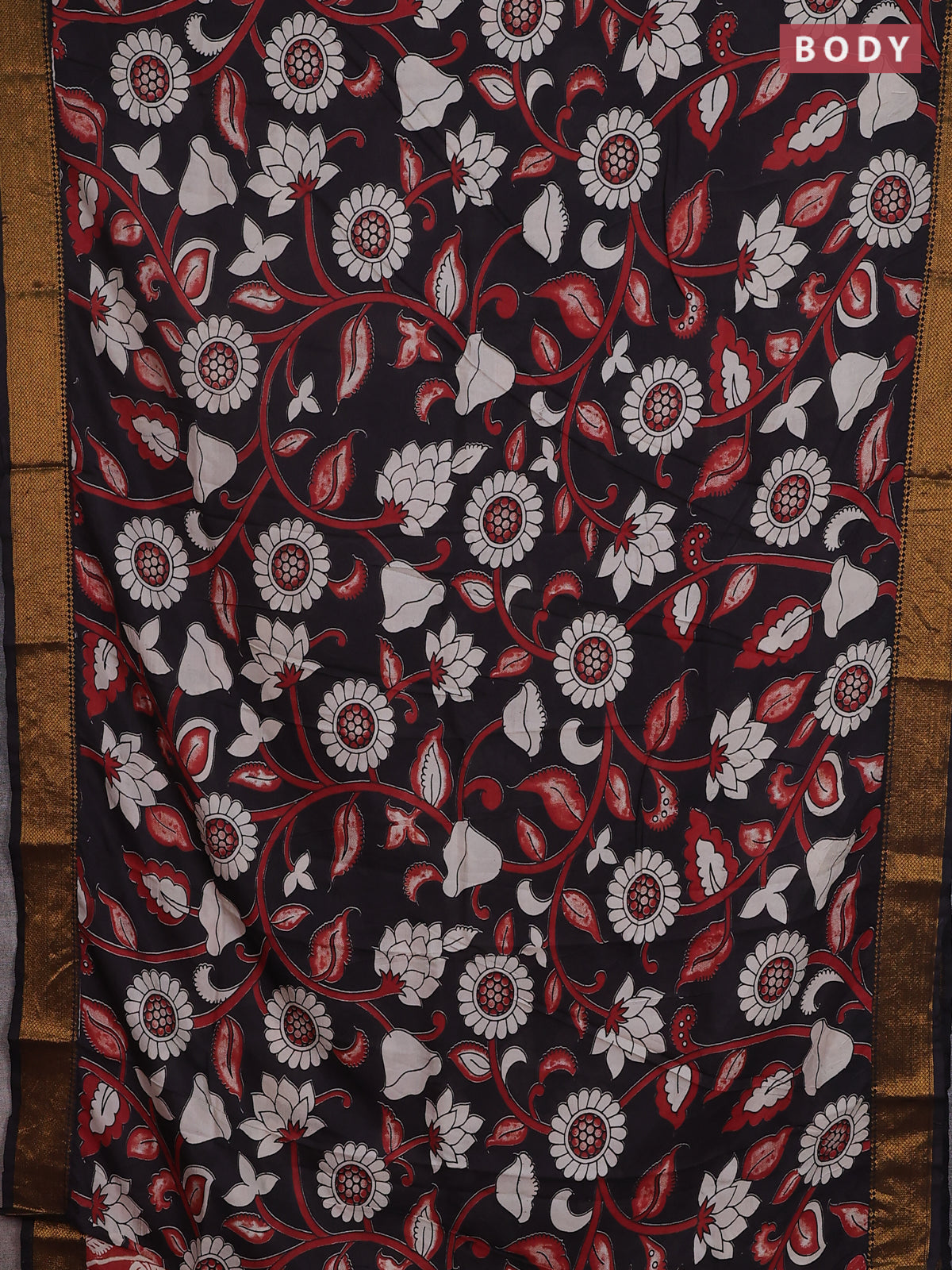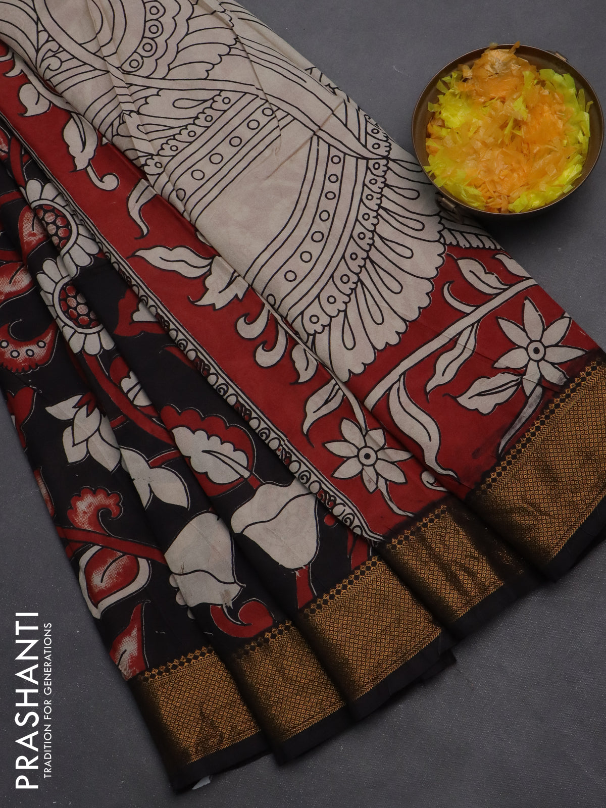Kalamkari semi silk saree black with allover prints and zari woven border