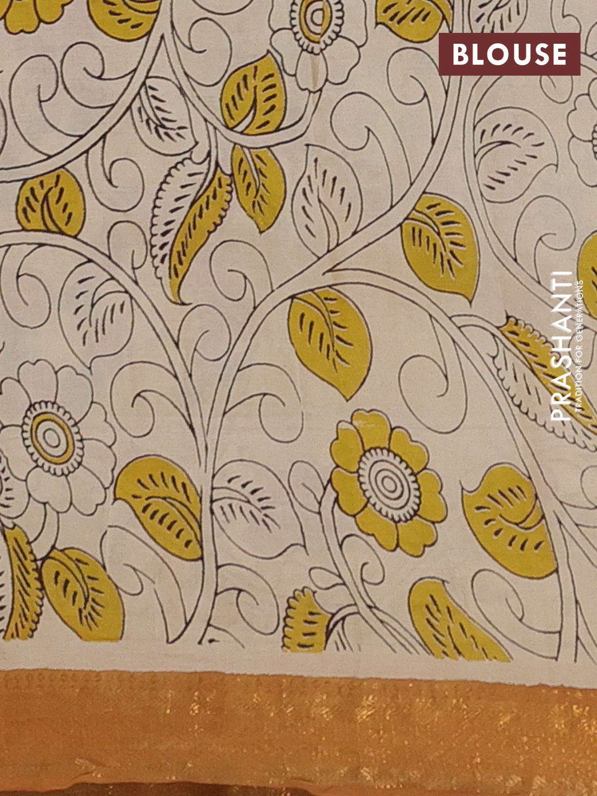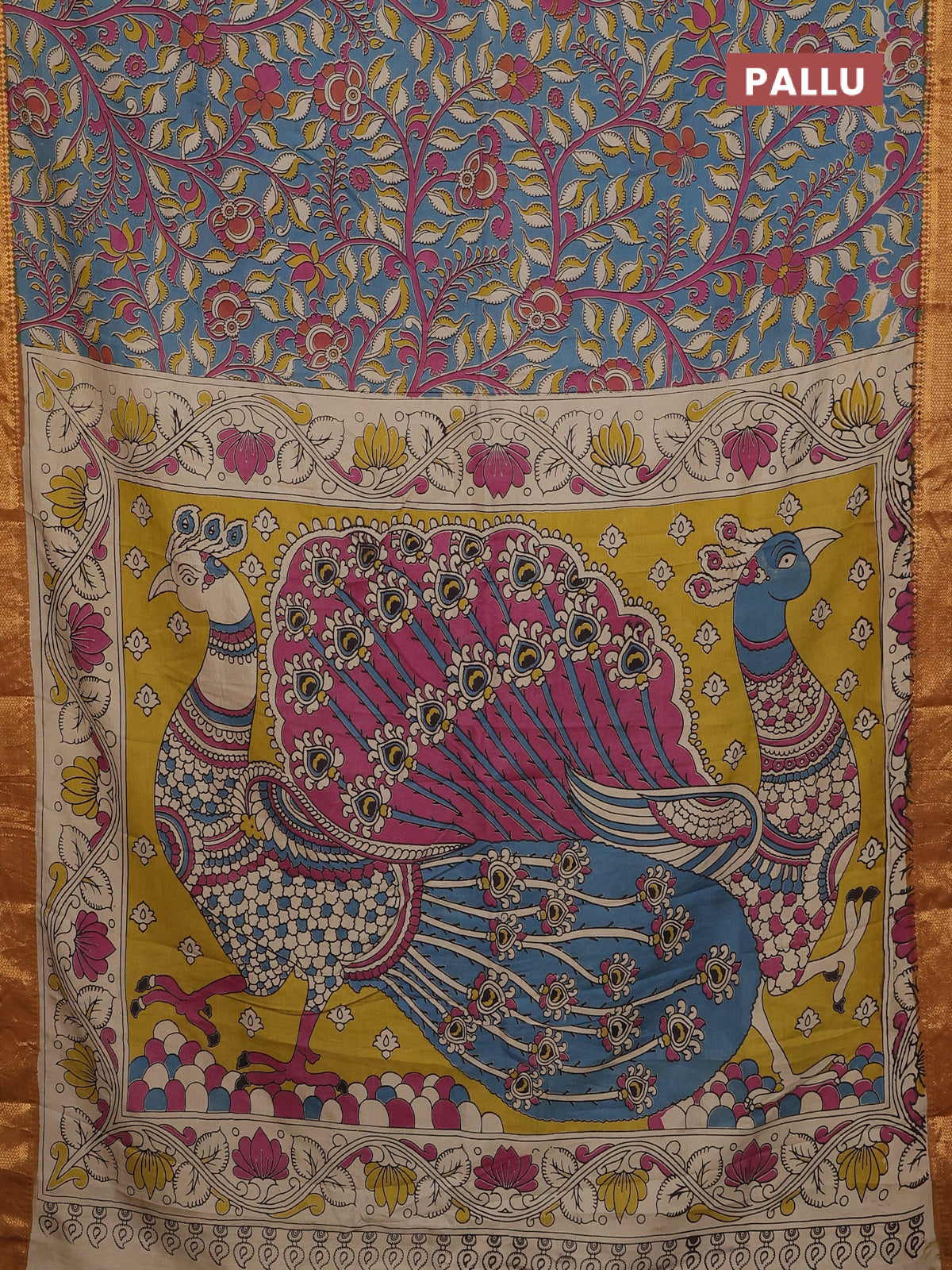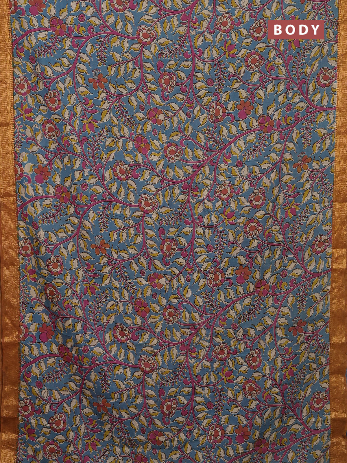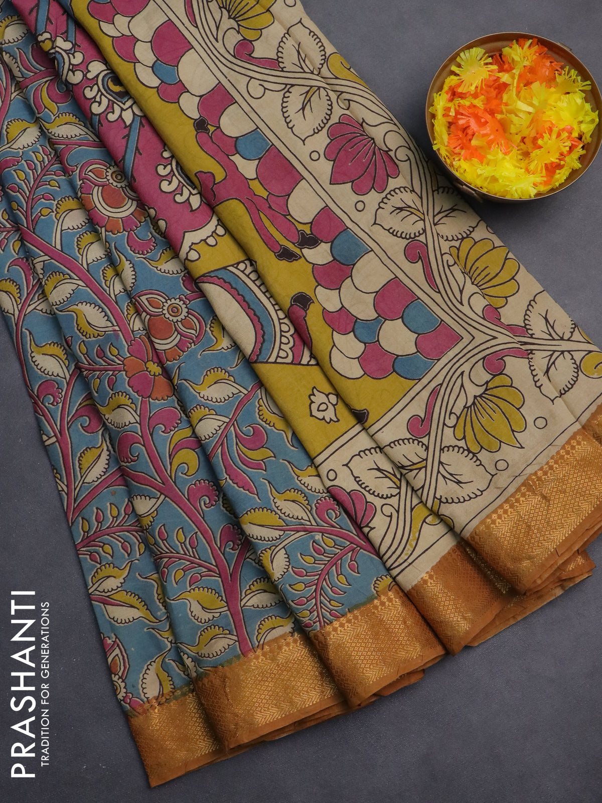 Kalamkari semi silk saree blue shade and mustard yellow with allover prints and zari woven border