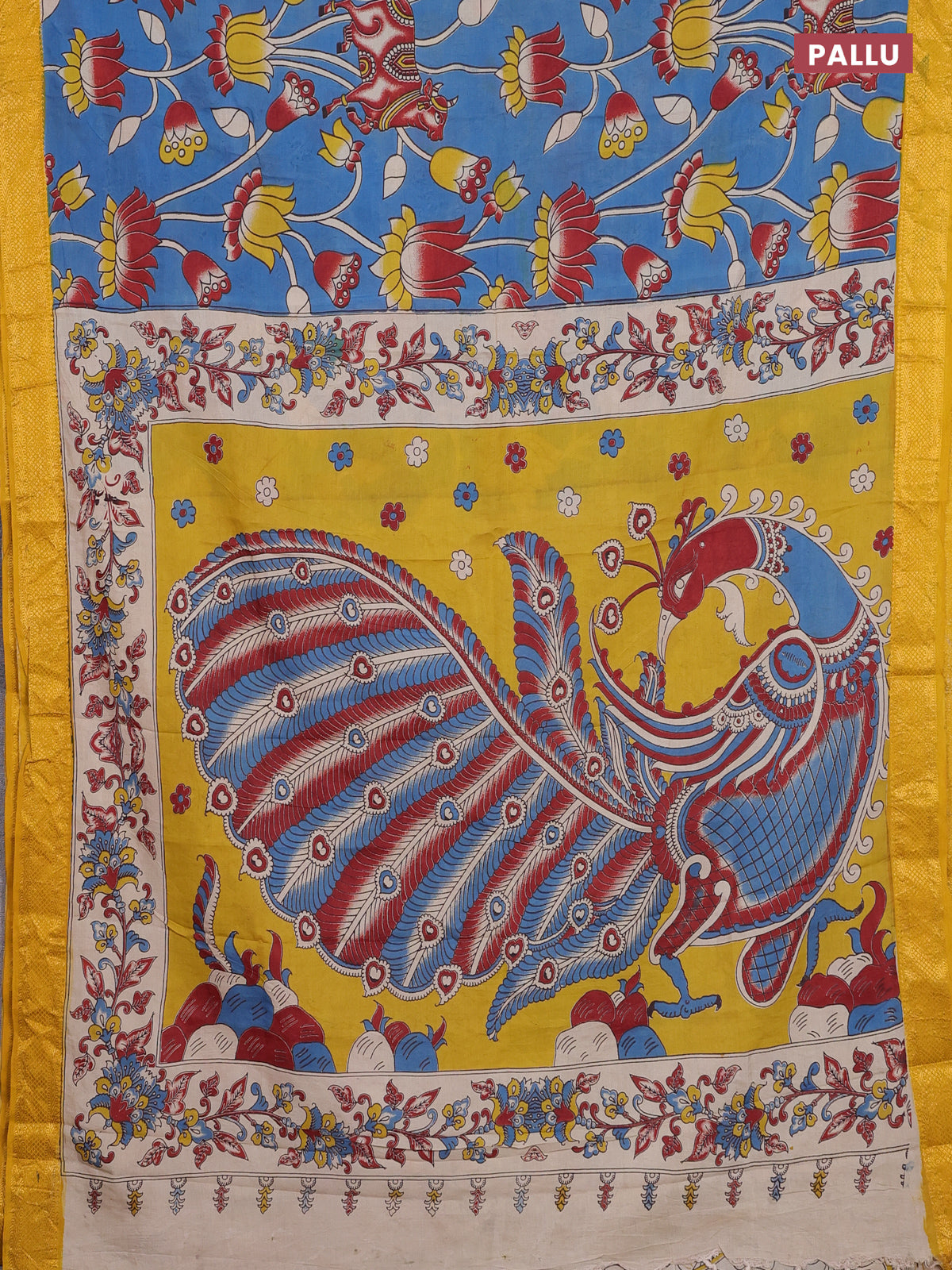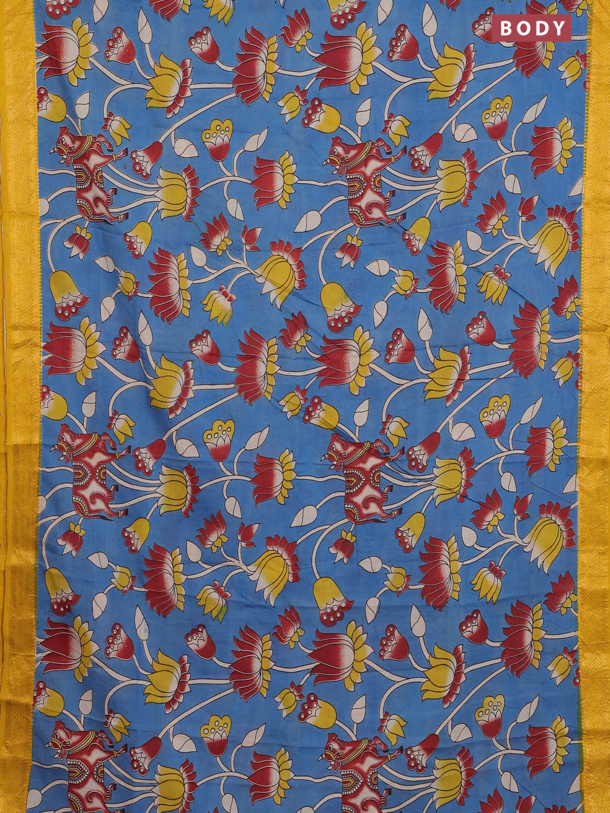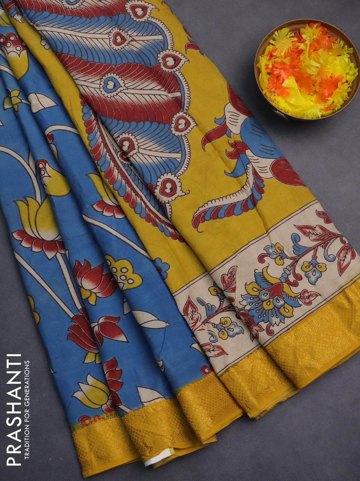 Kalamkari semi silk saree cs blue and yellow with allover prints and zari woven border
