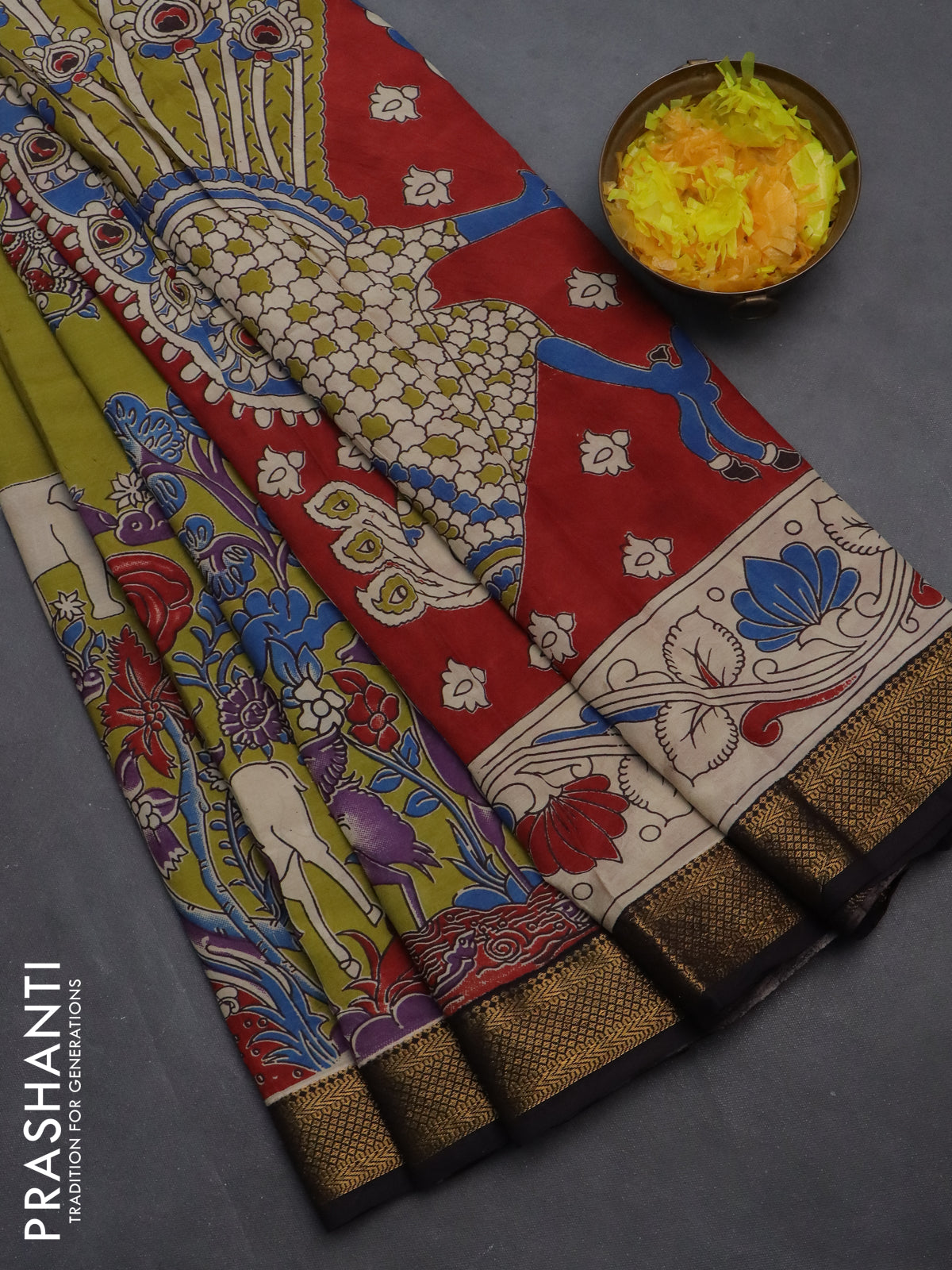 Kalamkari semi silk saree light green and black with allover prints and zari woven border