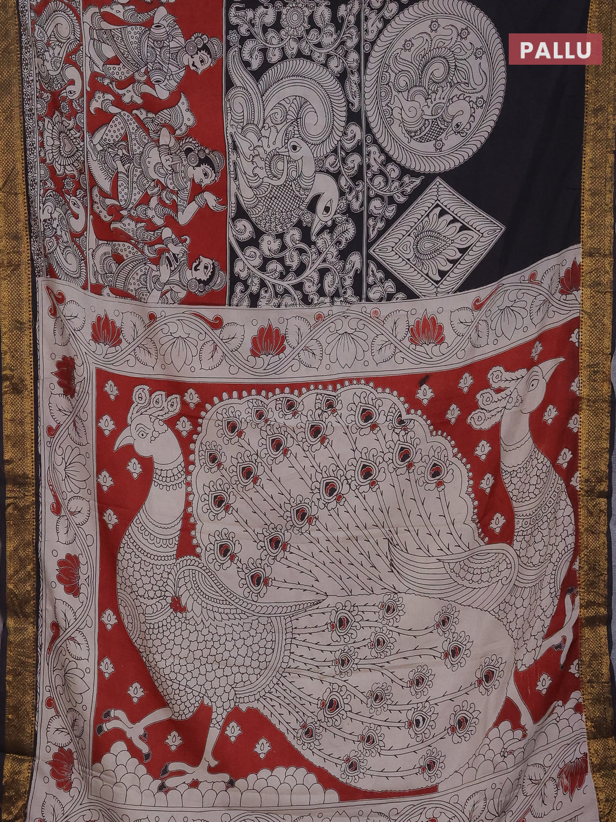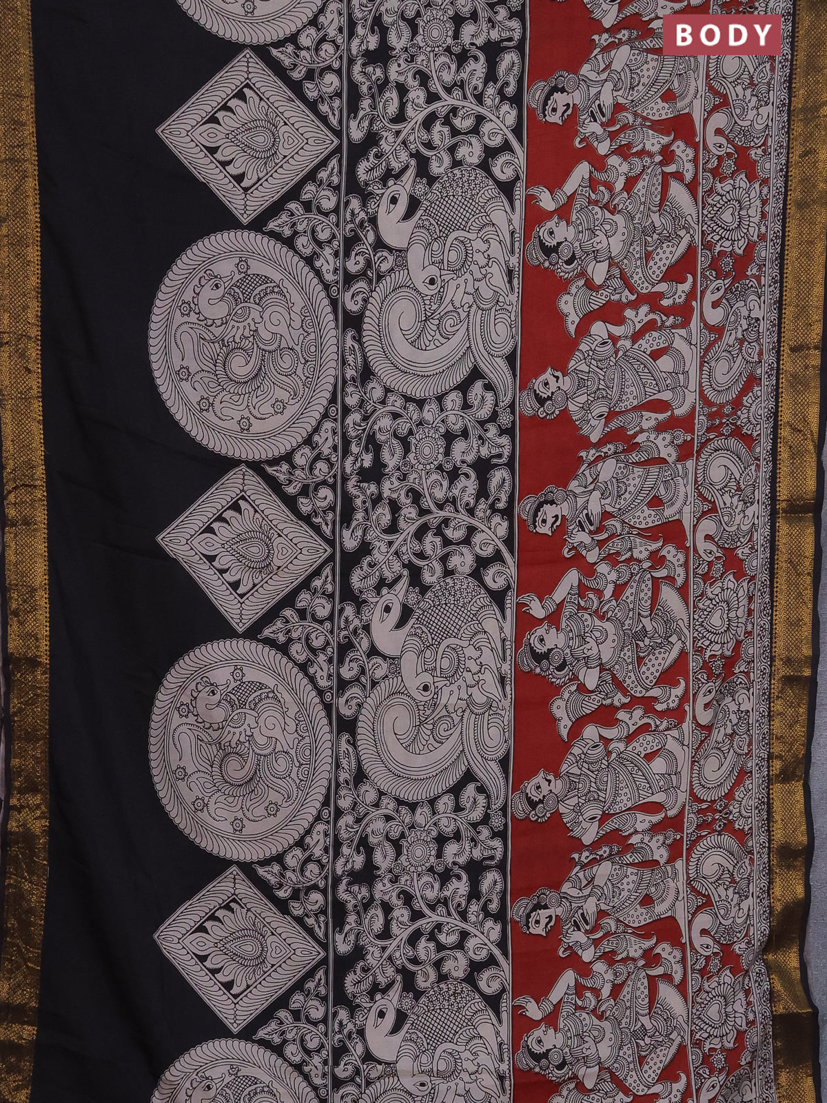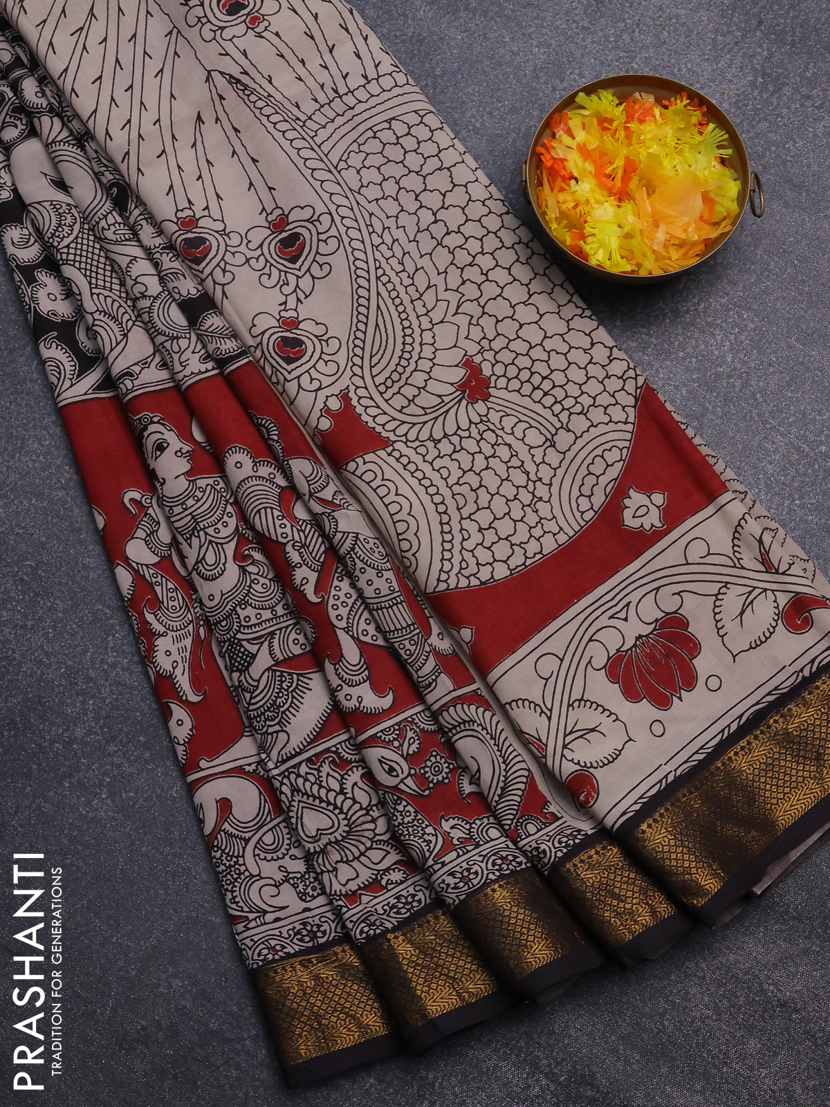 Kalamkari semi silk saree maroon and black with allover prints and zari woven border