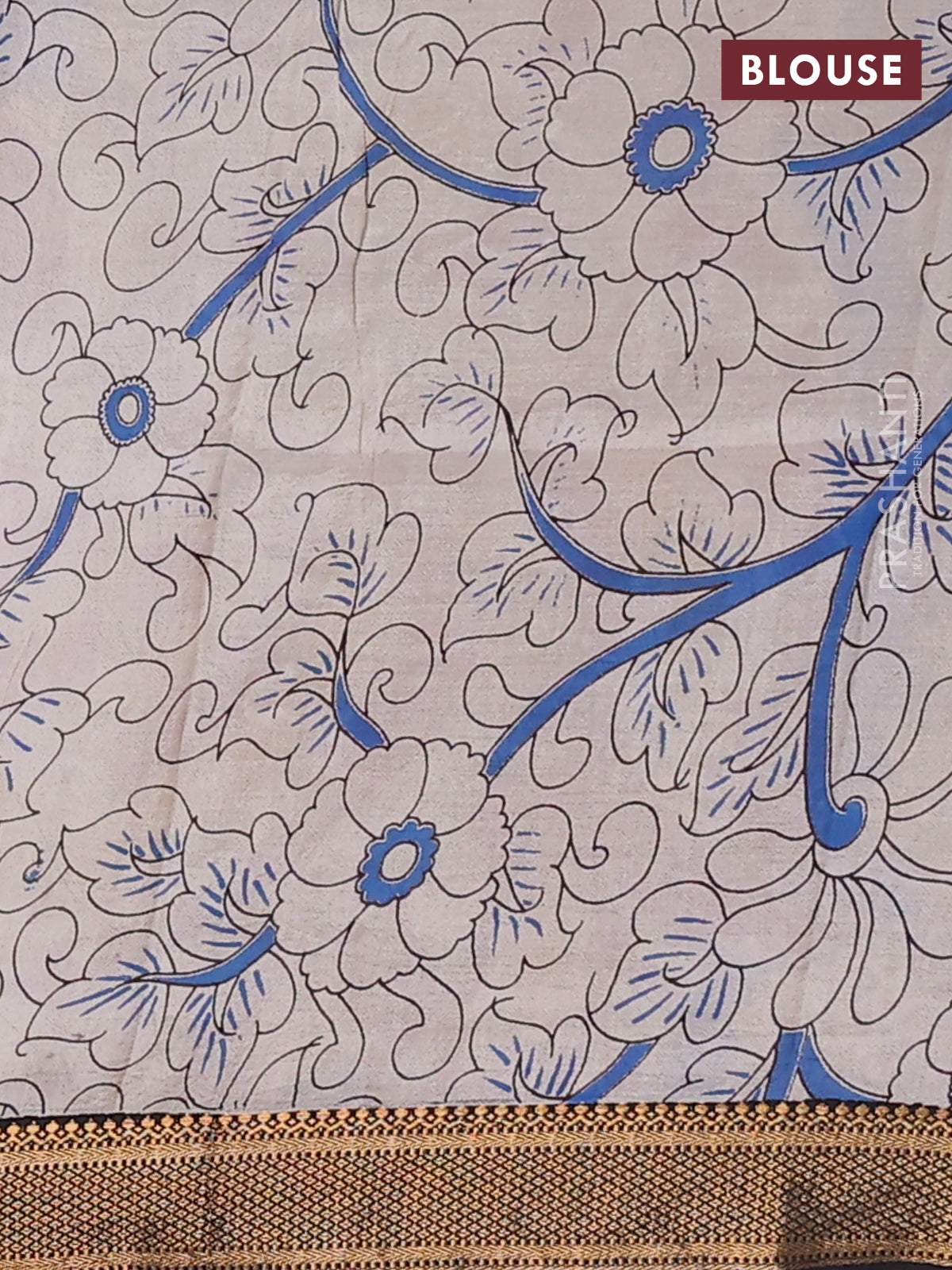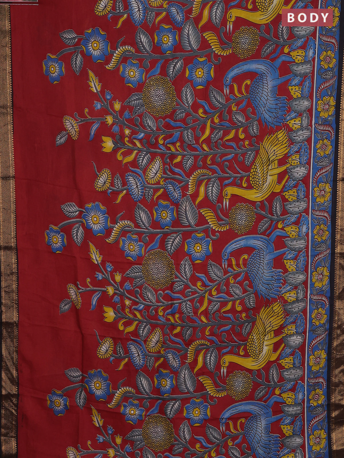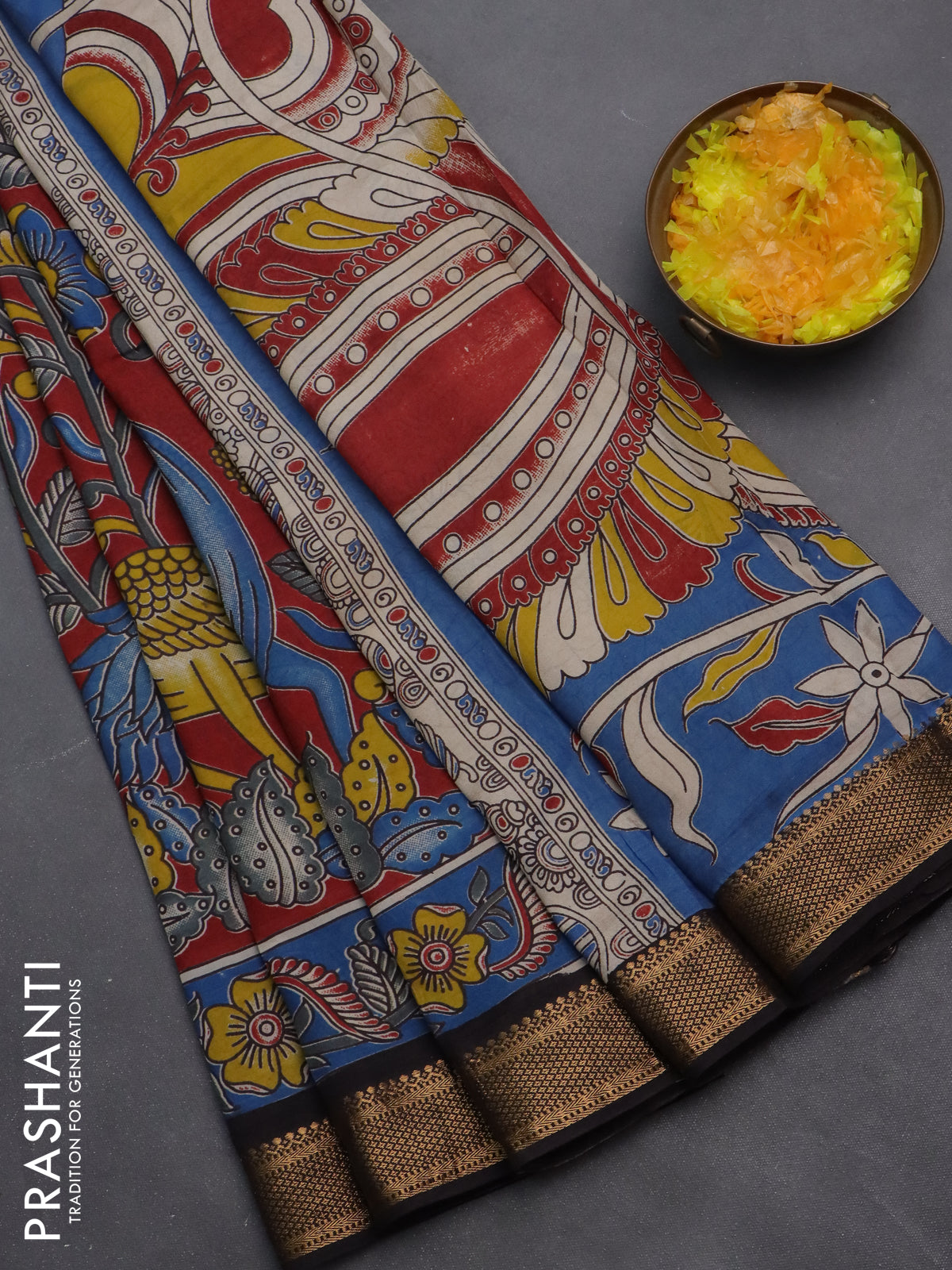 Kalamkari semi silk saree maroon and blue black with allover prints and zari woven border