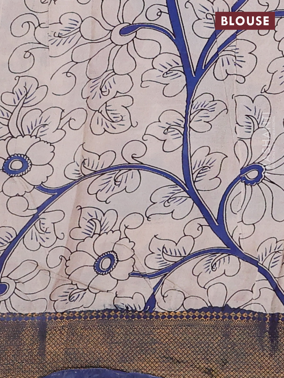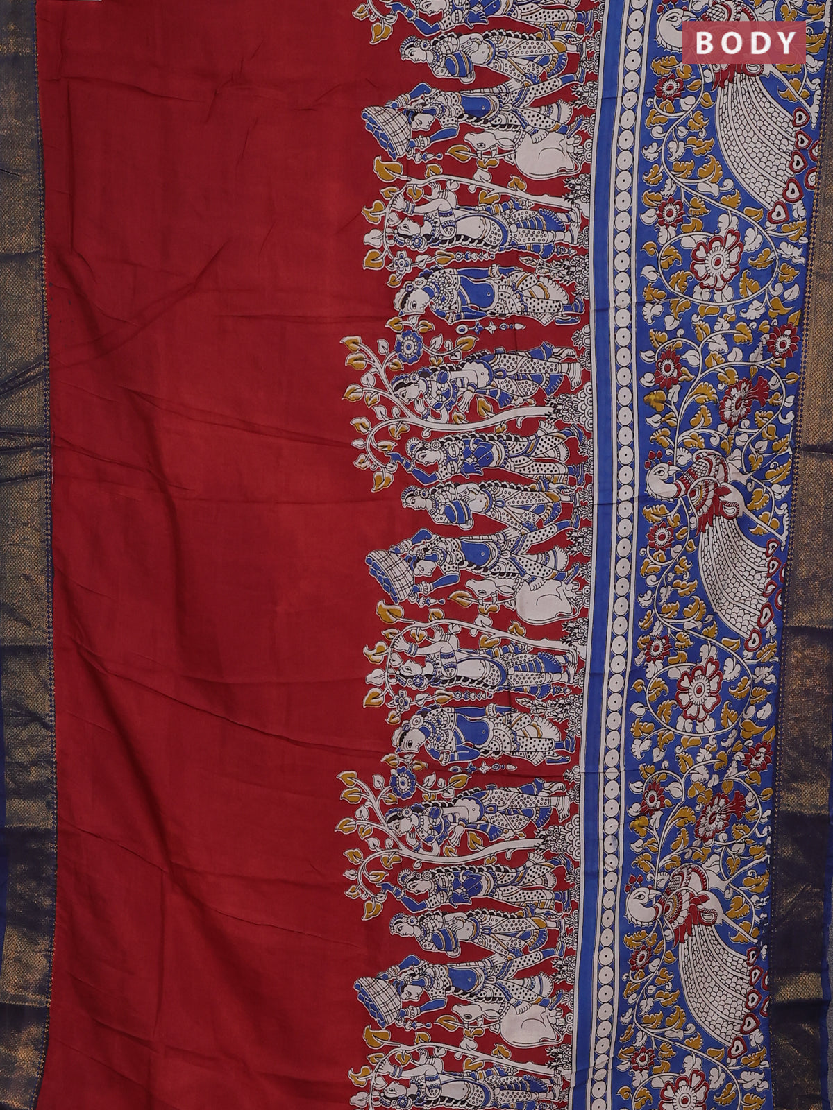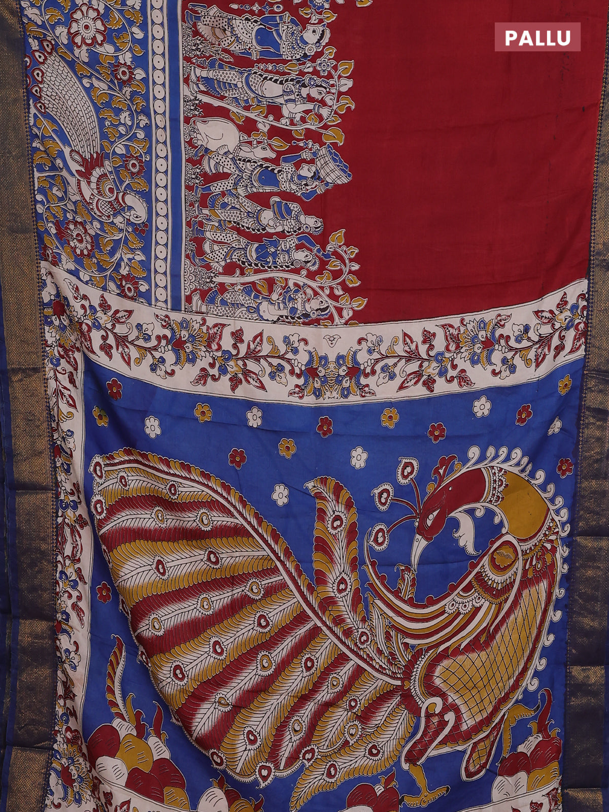 Kalamkari semi silk saree maroon and blue with allover prints and zari woven border